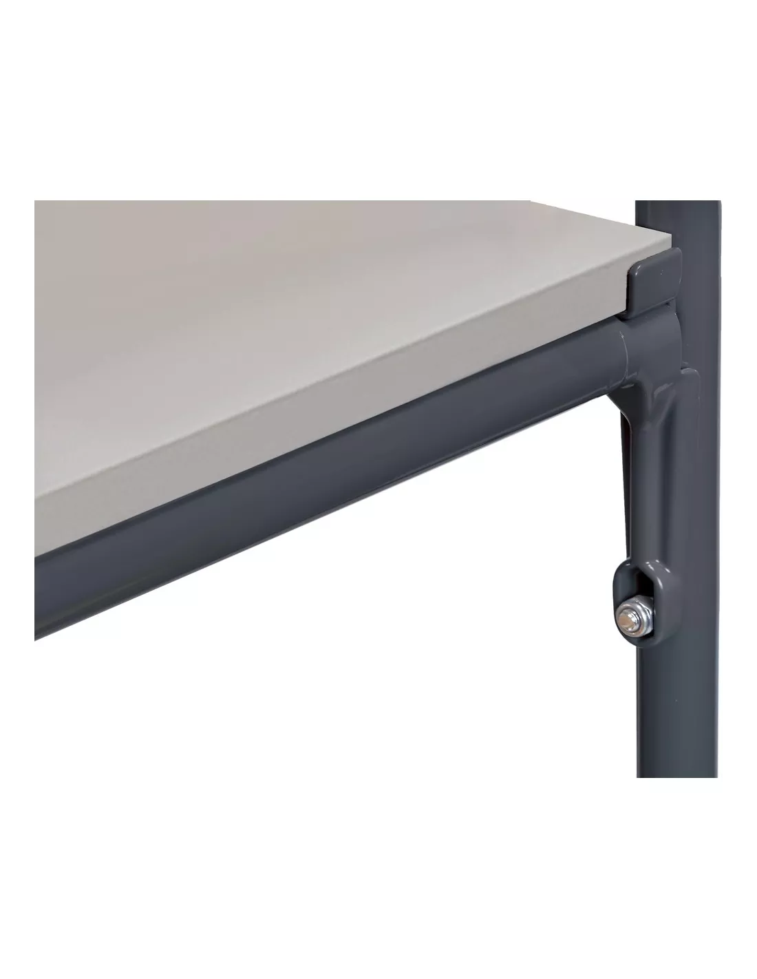 Ces entretoises avec brides et vissage en deux points en gris anthracite sont simplement vissées sous une étagère existante. Cela stabilise la structure et augmente la capacité de charge des étagères. Grâce au soutien, la tablette qui se trouve au-dessus des entretoises de renfort supporte 150 kg au lieu de 90 kg. 1 paire est déjà fournie par chariot à plateaux Gamme en gris.
