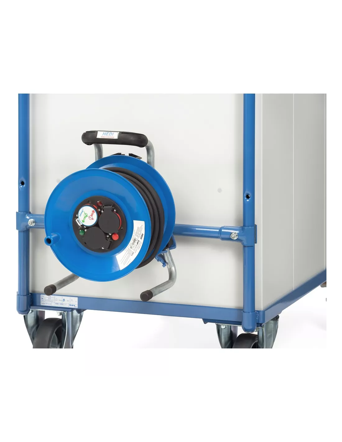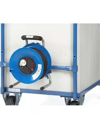 Kit de montage enrouleur avec câble pour chariots légers d’une largeur de 800 mm. Revêtement époxy Bleu RAL 5007. Montage aisé au moyen d’attaches à fixer aux tubes. Protégé contre la chaleur et l'humidité 25 m de câble 3 x 1,5. Verrouillable par cadenas (non fourni à la livraison). Pour modèle 2746, 2756, 2946, 2956.