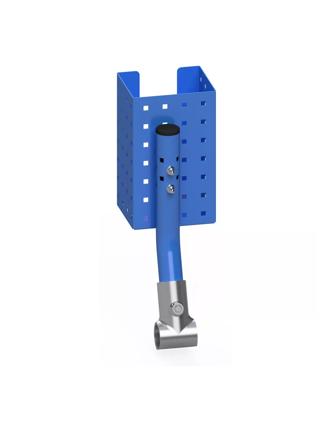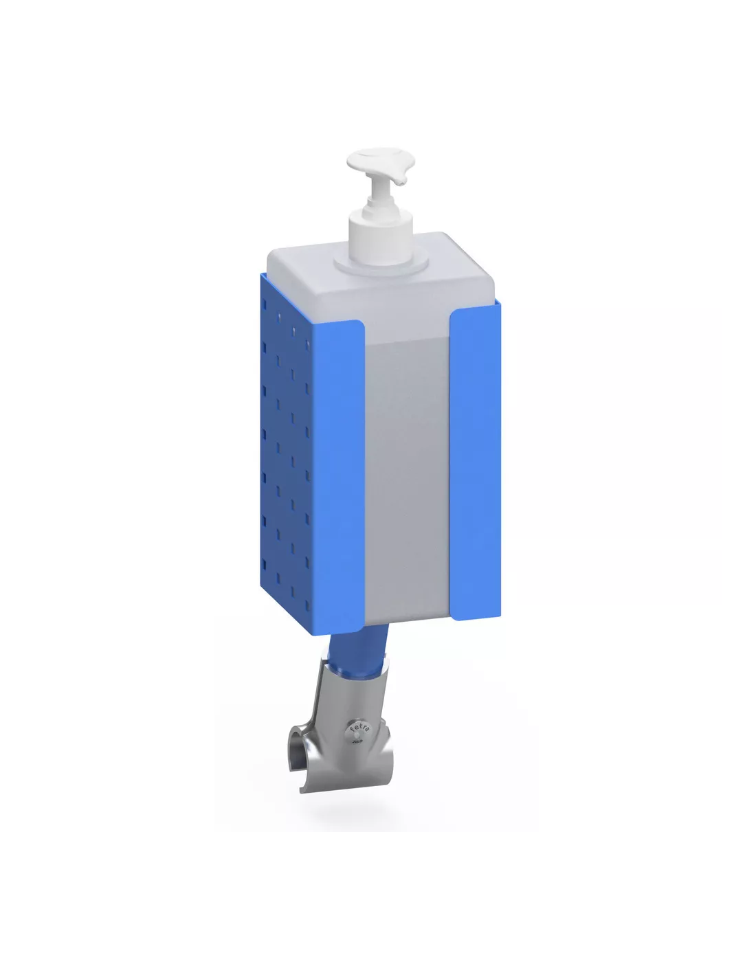 Support en tôle d’acier pour bouteilles de gel désinfectant, kit avec revêtement par poudre époxy bleu RAL 5007. Fixation modulable soit à l’arrière ou sur les côtés. Tube de fixation perforé à de nombreux endroits, avec une mâchoire permettant un positionnement multi-directionnel. Pour bouteille euro standard de 1000 ml vendue dans les commerces. Bouteilles non incluses dans la livraison.
