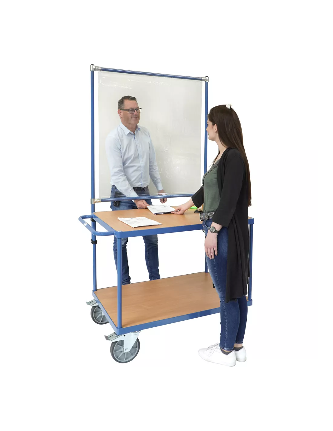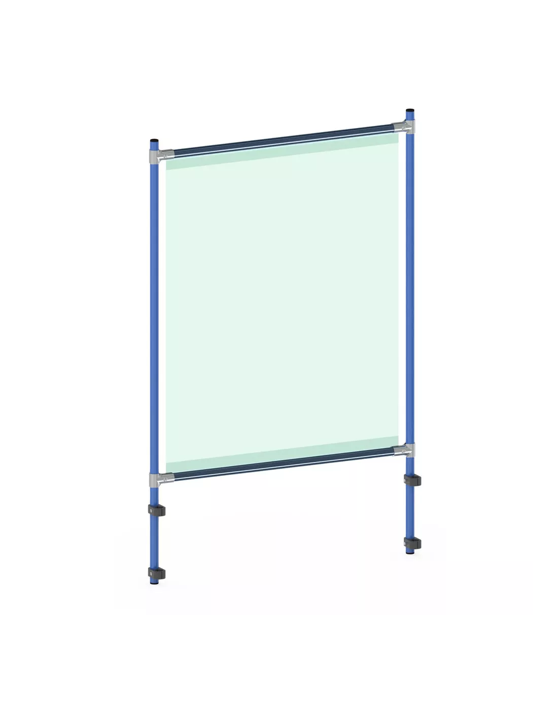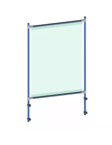 Armature de protection en tant que kit pour de nombreux équipements fetra. Ossature en tube d‘acier à boulonner, avec revêtement époxy bleu RAL 5007,  comme protection contre le coronavirus par exemple. Kit facile à monter au moyen d’attaches en plastique, même à postériori. Hauteur réglable permettant de laisser un passage à sa base.