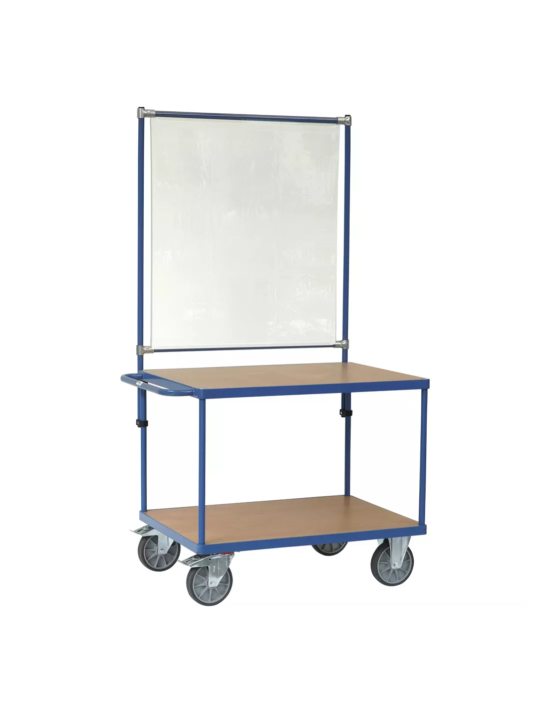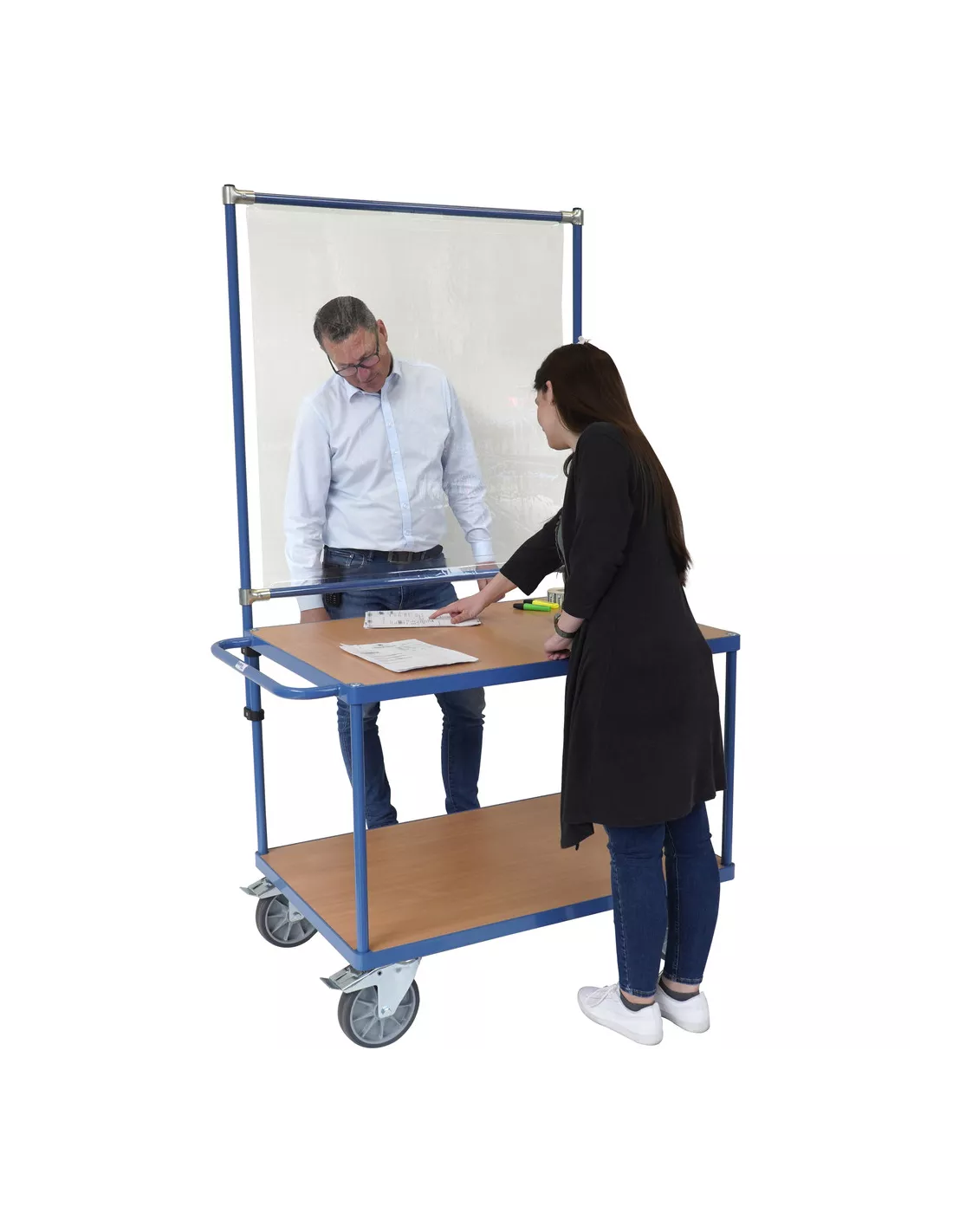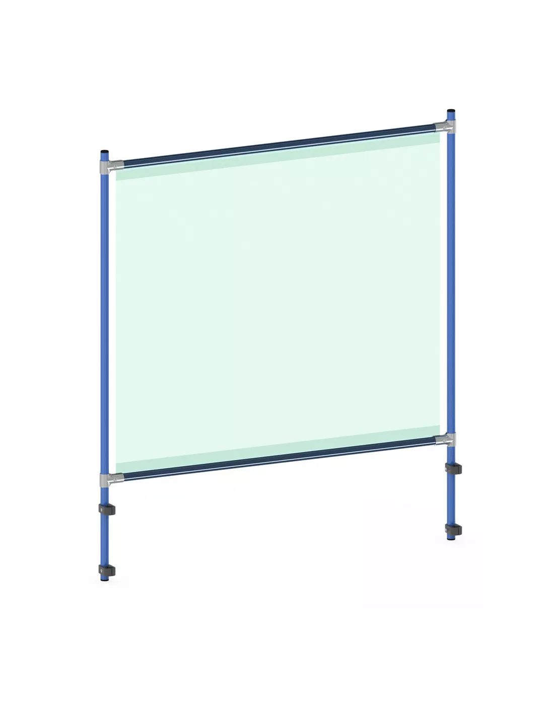 Armature de protection en tant que kit pour de nombreux équipements fetra. Ossature en tube d‘acier à boulonner, avec revêtement époxy bleu RAL 5007,  comme protection contre le coronavirus par exemple. Kit facile à monter au moyen d’attaches en plastique, même à postériori. Hauteur réglable permettant de laisser un passage à sa base.