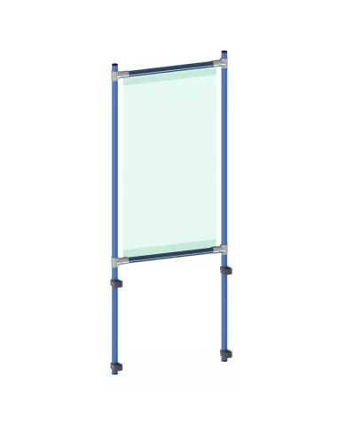 Armature de protection en tant que kit pour de nombreux équipements fetra. Ossature en tube d‘acier à boulonner, avec revêtement époxy bleu RAL 5007,  comme protection contre le coronavirus par exemple. Kit facile à monter au moyen d’attaches en plastique, même à postériori. Hauteur réglable permettant de laisser un passage à sa base.