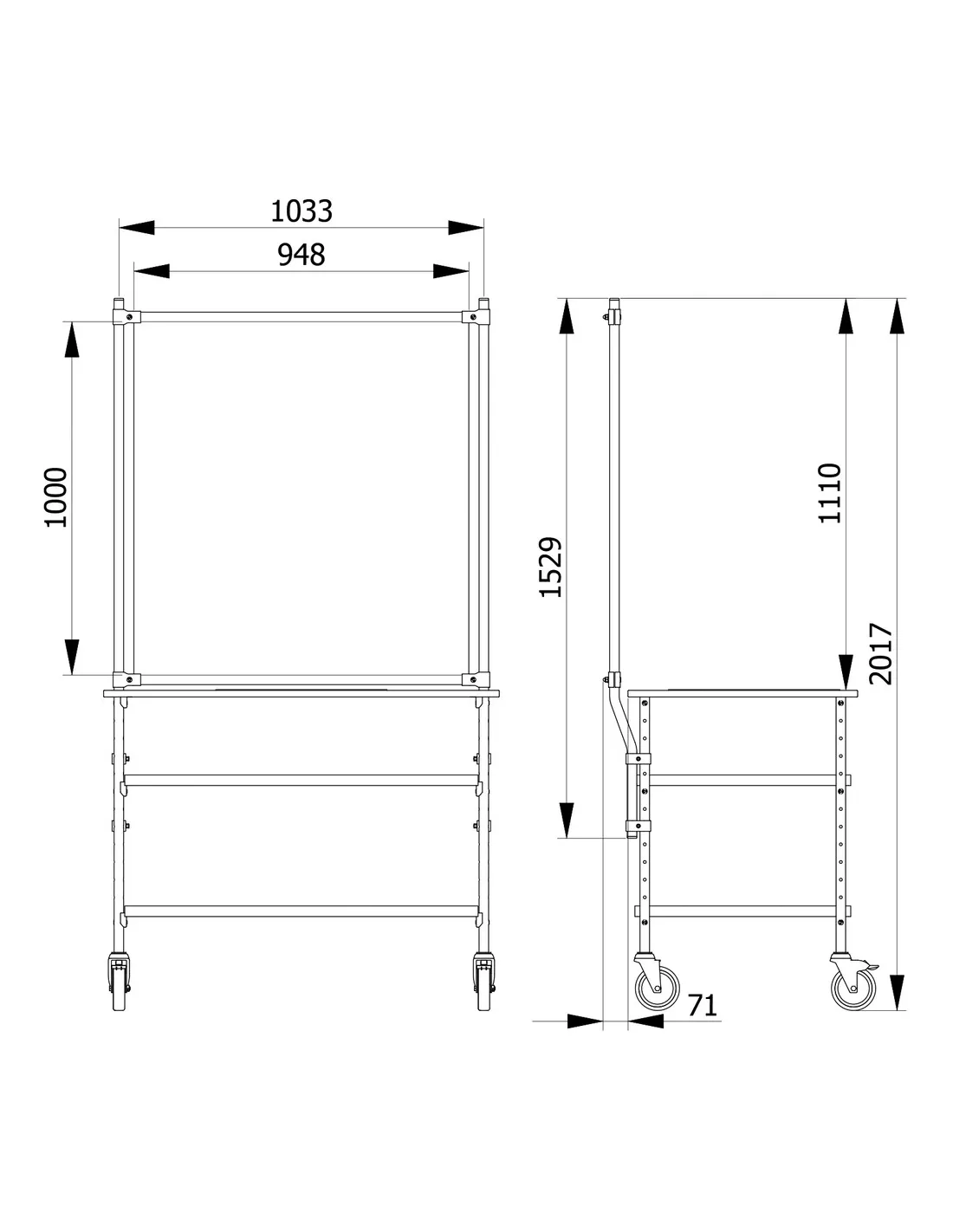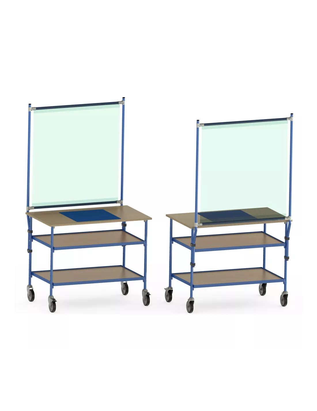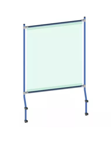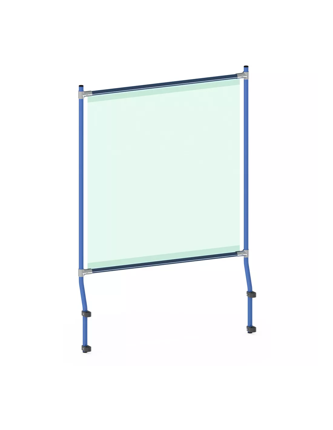 Armature de protection en tant que kit pour de nombreux équipements fetra. Ossature en tube d‘acier à boulonner, avec revêtement époxy bleu RAL 5007,  comme protection contre le coronavirus par exemple. Kit facile à monter au moyen d’attaches en plastique, même à postériori. Hauteur réglable permettant de laisser un passage à sa base.