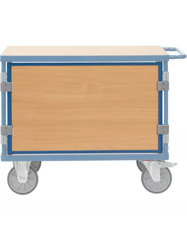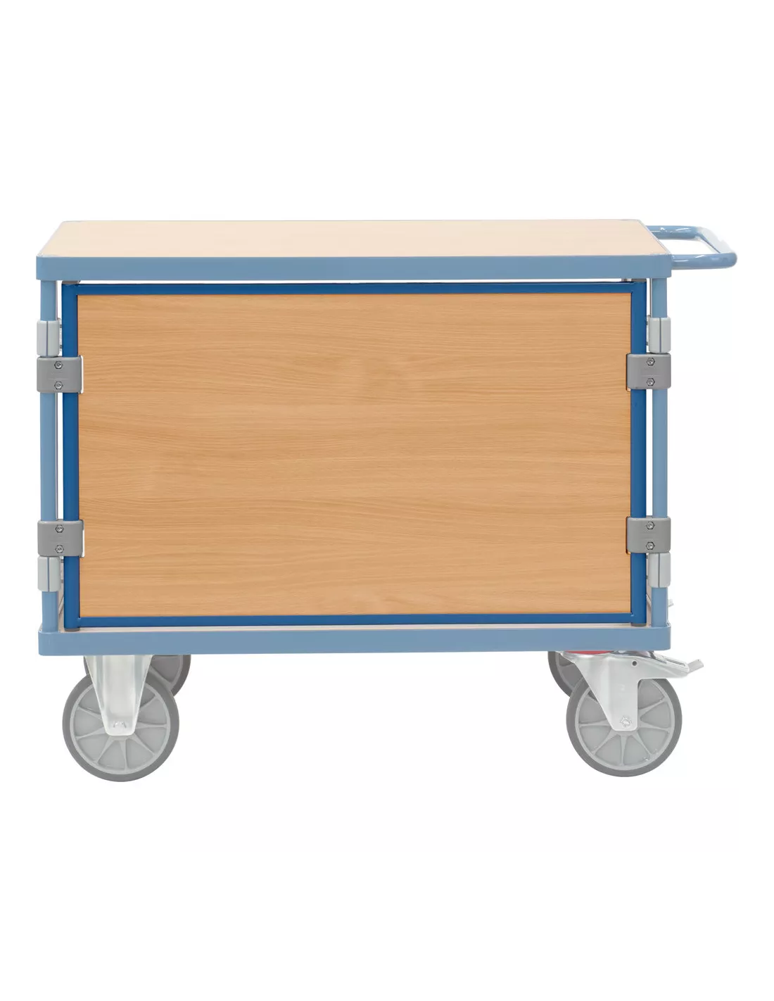 En mélaminé surface effet hêtre dans cadre acier revêtement époxy RAL 5007. Montage facile grâce à des attaches en plastique. Pour tous chariots MultiVario à 2 étages.