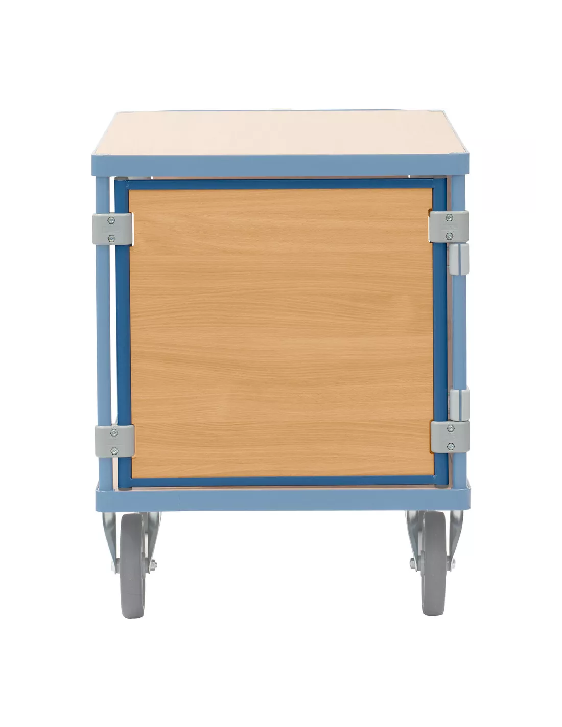 En mélaminé surface effet hêtre dans cadre acier revêtement époxy RAL 5007. Montage facile grâce à des attaches en plastique. Pour tous chariots MultiVario à 2 étages.