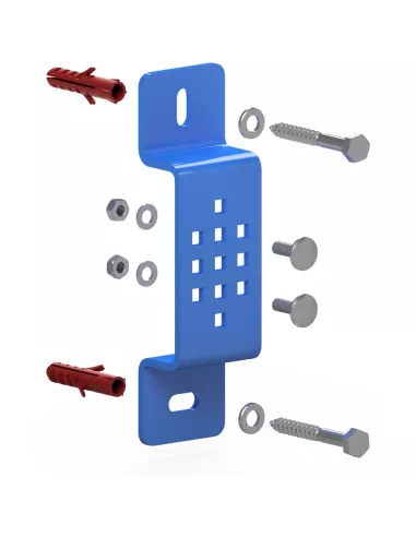 Le set de fixation mural de support de bouteille de gel désinfectant est composé de : 2 vis à bois 6x50 avec 2 rondelles, 2 chevilles de 8 et 2 vis à tête bombée avec rondelles en U et écrou de sécurité.