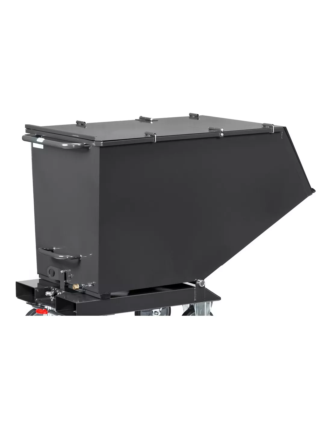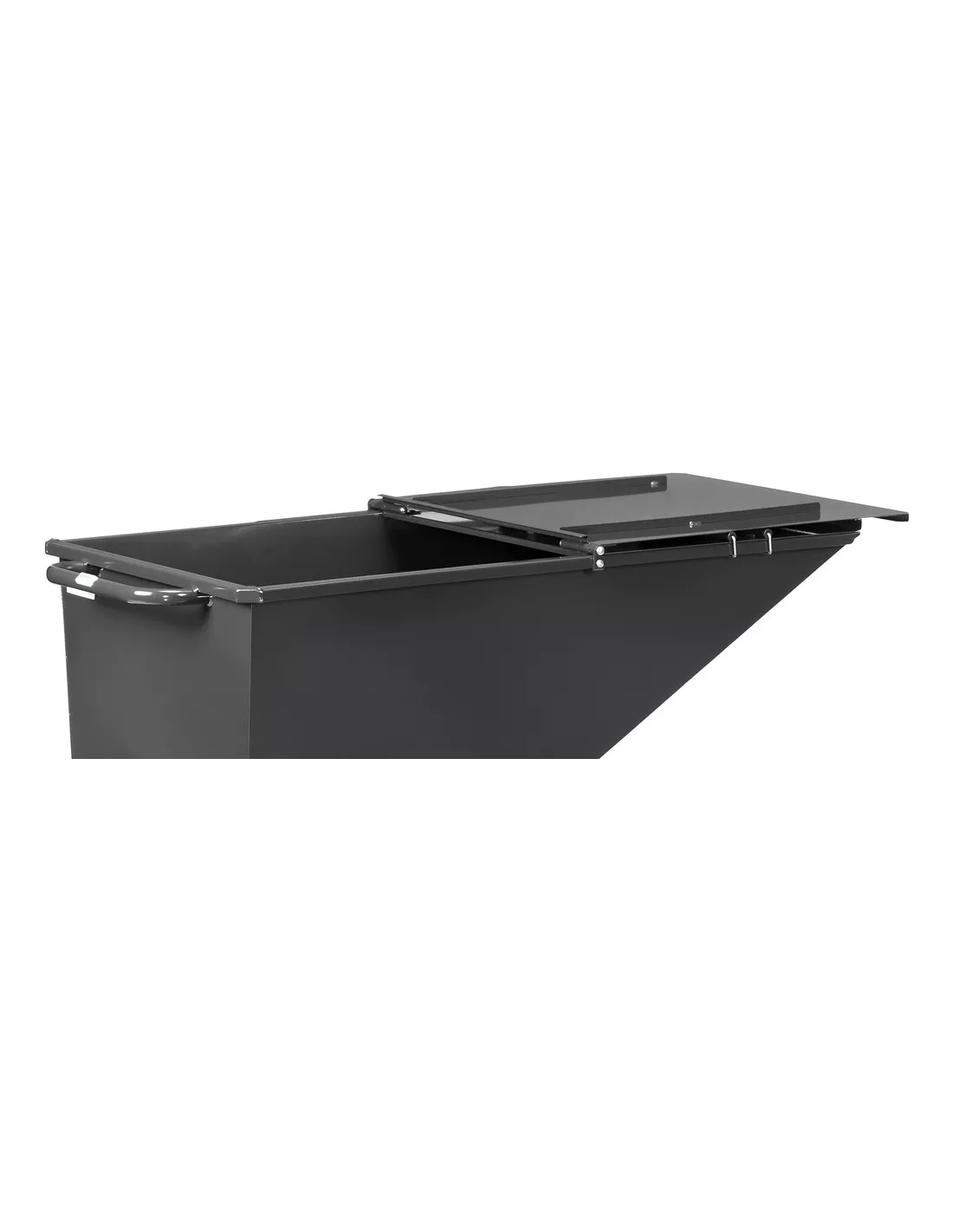 Couvercle rabattable pour benne, ouverture sur 2 parties. Fermeture sécurisée par crochet à ressort. Partie avant peut être verrouillée par crochet à ressort évitant le déversement accidentel. Partie arrière également verrouillable. Gouttière pour bonne prise en main sur partie avant et arrière. Tôle d'acier de 1,5 mm, renforcement interne en fer plat de 15 x 3 mm. Pas d'angles saillants externes. Revêtement époxy Gris Anthracite RAL 7016. Livrable à postériori. Supplément par chariot-benne.