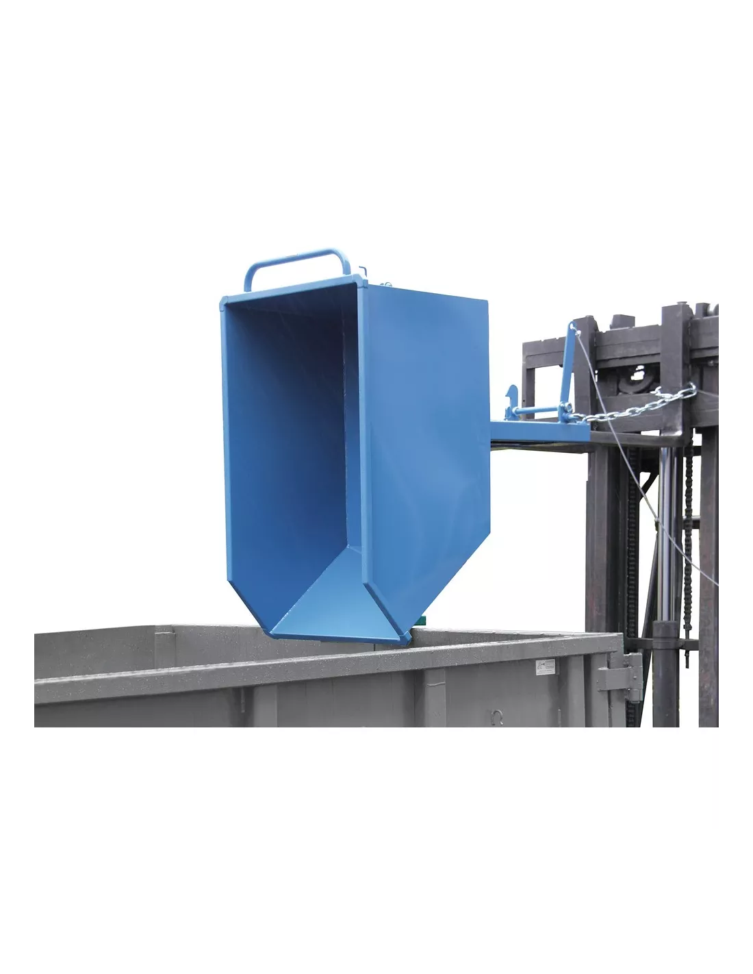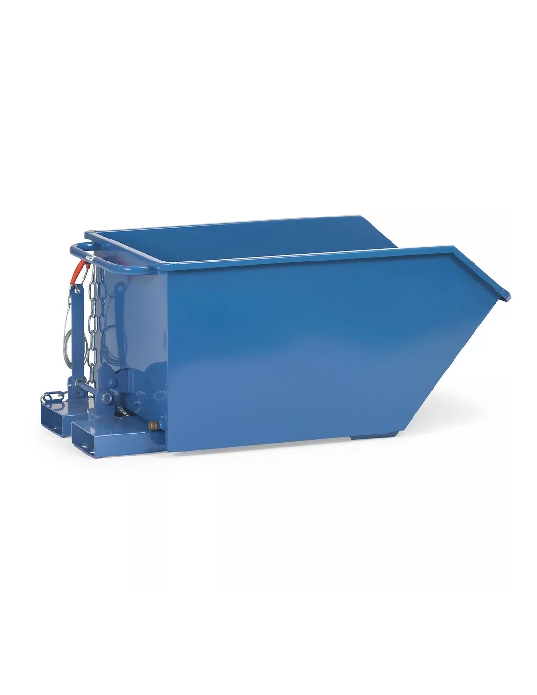 Construction robuste en tôle d'acier de 2 mm mécano-soudée et étanche. Revêtement époxy bleu RAL 5007. De série avec passage de fourches. Versement sans risque de basculement, verrouillage anti-ouverture et chaîne de sécurité. Système d'ouverture par câble ramené au siège du conducteur. Versement automatique, même en cas de chargement partiel, la benne est automatiquement vidée. Les bennes doivent être vidées par un chariot élévateur. En descendant la benne vers le sol celle-ci se remet en place et peut à nouveau être chargée. Livrée avec câble. Roues en option.