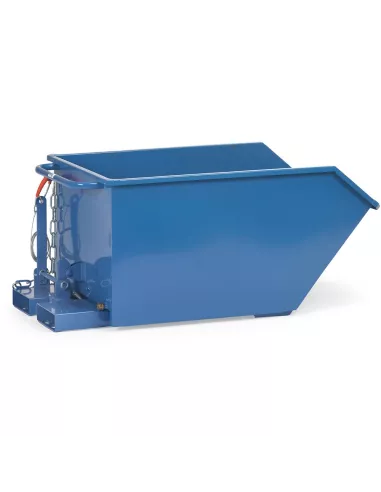 Construction robuste en tôle d'acier de 2 mm mécano-soudée et étanche. Revêtement époxy bleu RAL 5007. De série avec passage de fourches. Versement sans risque de basculement, verrouillage anti-ouverture et chaîne de sécurité. Système d'ouverture par câble ramené au siège du conducteur. Versement automatique, même en cas de chargement partiel, la benne est automatiquement vidée. Les bennes doivent être vidées par un chariot élévateur. En descendant la benne vers le sol celle-ci se remet en place et peut à nouveau être chargée. Livrée avec câble. Roues en option.