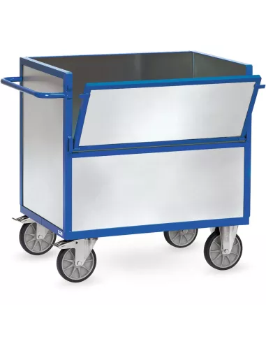 Dimensions utiles (L x l) : 1200 x 800 mm, Charge 600 kg, chariot caisse en tôle d'acier zinguée.