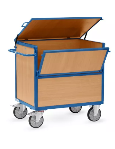 Ensemble mécano-soudé, revêtement époxy bleu RAL 5007. Chariot entièrement en mélaminé surface effet hêtre. Couvercle à double battant et anneau pour cadenas. 2 roues pivotantes et 2 roues fixes à bandage TPE, moyeu à roulement à billes central. Freins sur roues pivotantes.