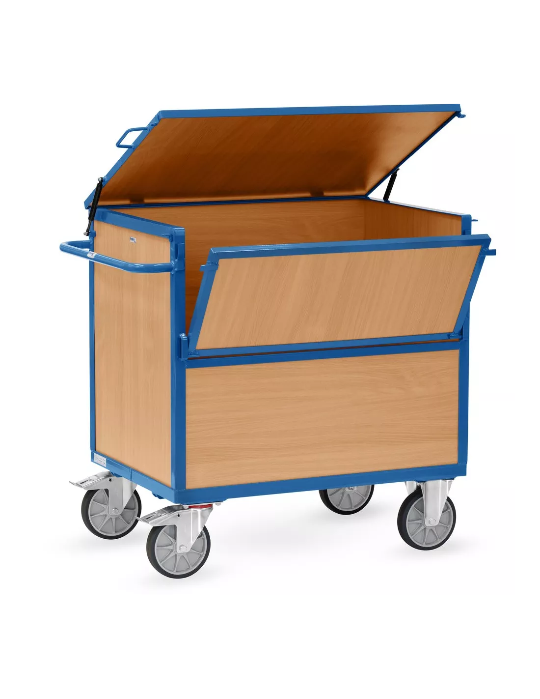 Dimensions utiles (L x l) : 1200 x 800 mm, Charge 600 kg, chariot caisse en bois avec couvercle.