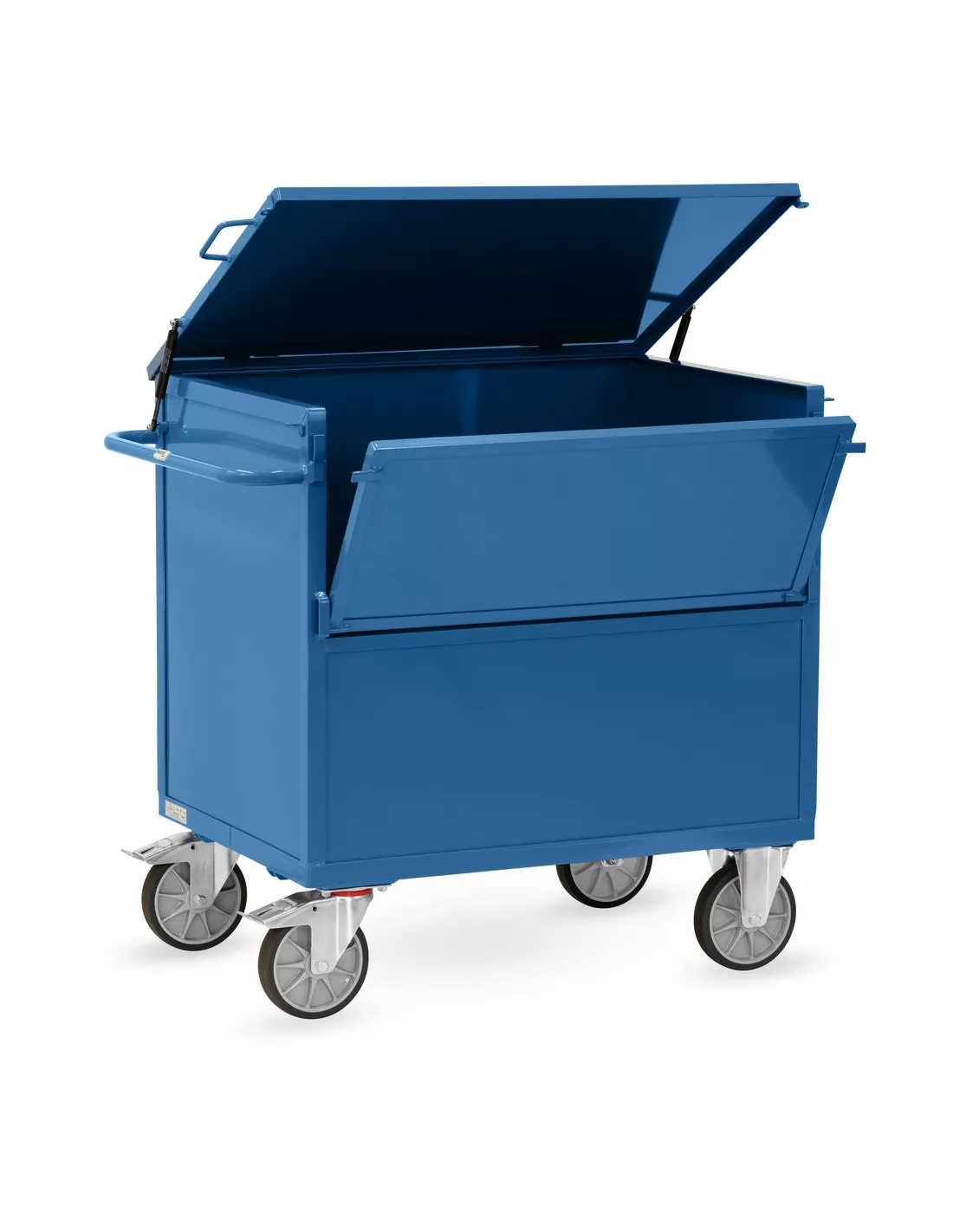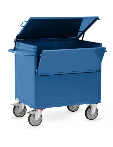 Ensemble mécano-soudé, revêtement époxy bleu RAL 5007. Chariot entièrement en tôle d'acier. Couvercle à un battant et anneau pour cadenas. 2 roues pivotantes et 2 roues fixes à bandage TPE, moyeu à roulement à billes central. Freins sur roues pivotantes.