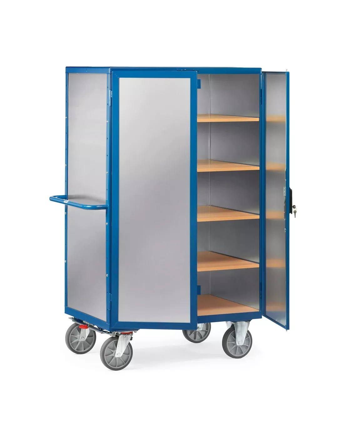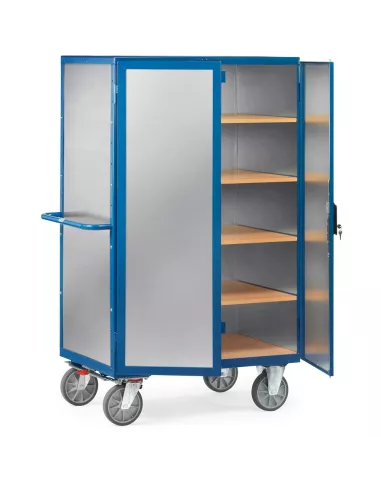 Ensemble mécano-soudé, revêtement époxy bleu RAL 5007. 3 ridelles et un toit habillés de tôle d'aluminium d'une épaisseur de 1,5 mm. Construction en profilé et tube d'acier soudé avec dossier de poussée. 1 plateau fixe et 4 amovibles en mélaminé surface effet hêtre. Porte à double battant en profilé d'acier. Verrouillage par serrure à cylindre. 2 roues pivotantes et 2 fixes à bandage TPE (Élastomère thermoplastique), moyeu à roulement à billes de précision. Déplacement confortable: peu de résistance au démarrage, au déplacement et à la rotation. Déplacement peu bruyant sur sols plats, bandage non traçant. TOTALSTOP: chariots équipés de série du système de freinage centralisé du côté des roues pivotantes. Charge par étagère: 90 kg.