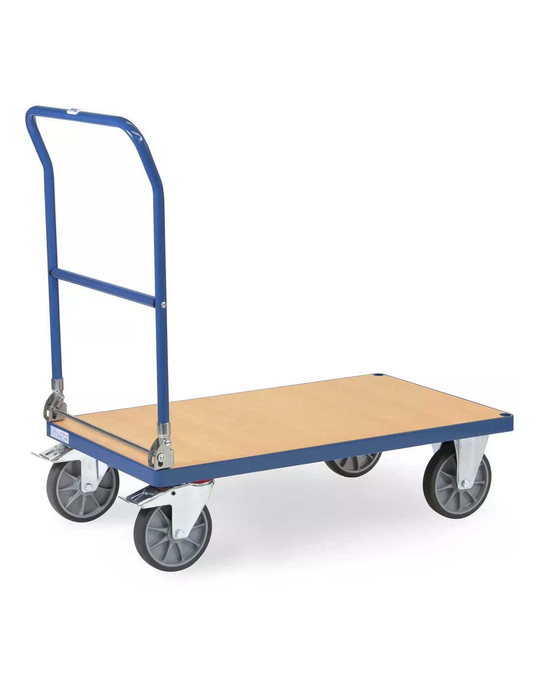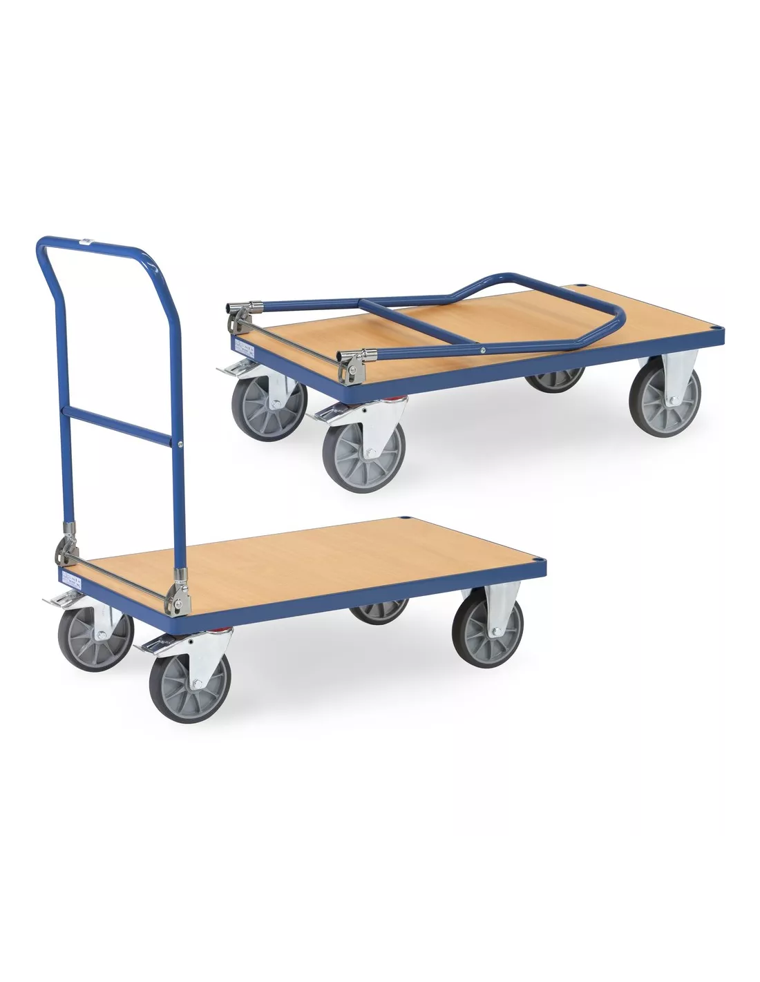 Chariot en d'acier mécano-soudé, revêtement époxy avec plateforme en mélaminé surface effet hêtre. Dossier de poussée rabattable sur la plateforme. 2 roues pivotantes et 2 roues fixes à bandage TPE, moyeu à roulement à billes central. Freins sur roues pivotantes.