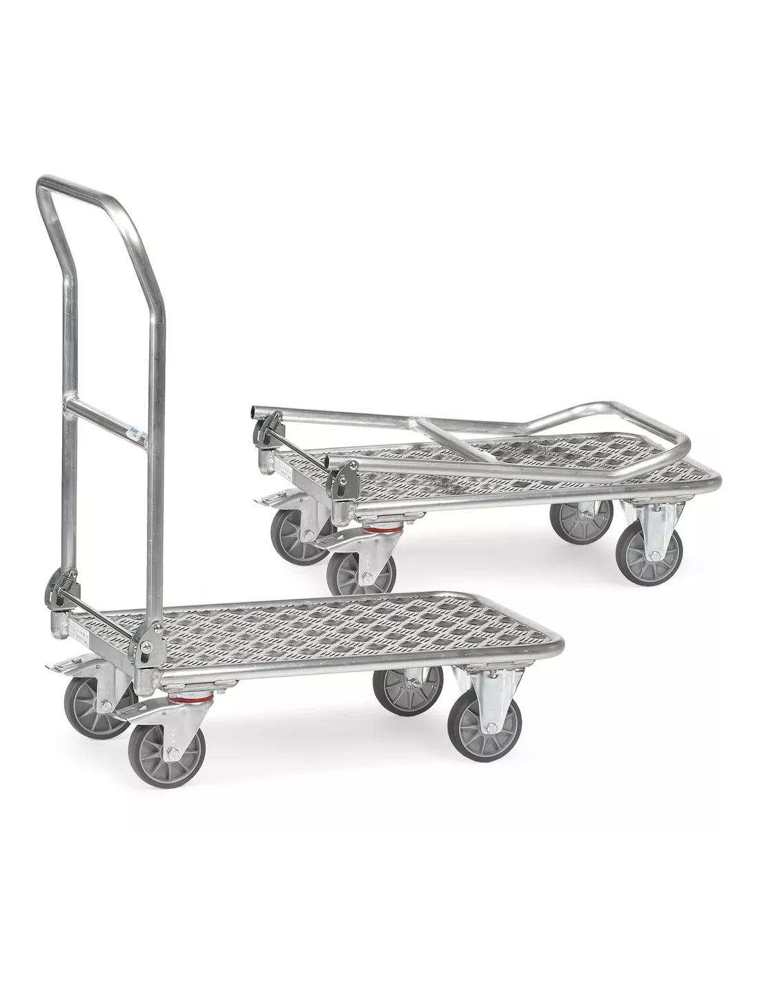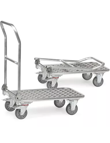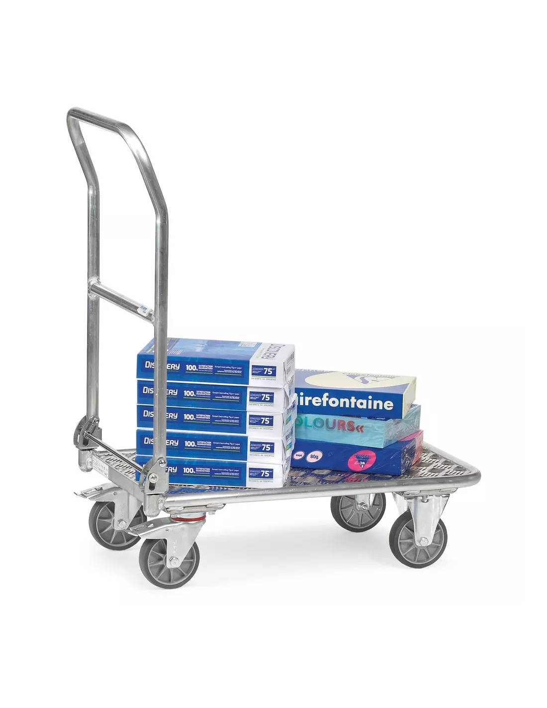 Chariot en tube d'acier et plateforme alu. Dossier rabattable sur la plateforme. 2 roues pivotantes et 2 roues fixes à bandage TPE, moyeu à roulement à billes central. Freins sur roues pivotantes.