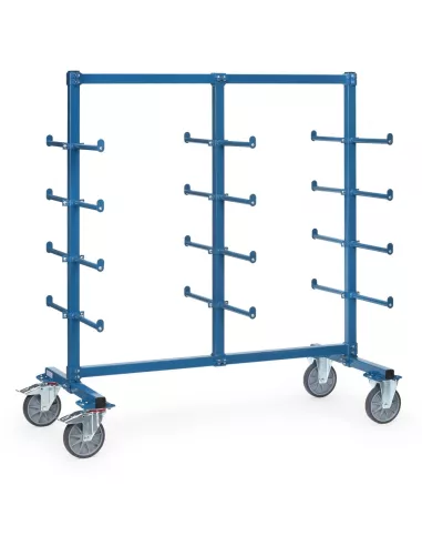 Ensemble mécano-soudé, revêtement époxy bleu RAL 5007. Système modulable pour éléments longs et stockage. Chariot complètement boulonné, barres réglables en hauteur. 2 faces avec 24 barres de portée (12 de chaque côté) habillées d'un tube de PVC de 3 mm d'épaisseur et avec butée de sécurité. Longueur utile: 600 mm. 2 roues fixes et 2 roues pivotantes à bandage TPE, moyeu à roulement à billes. Freins sur roues pivotantes. Charge par étage: 120 kg (60 kg de chaque côté).