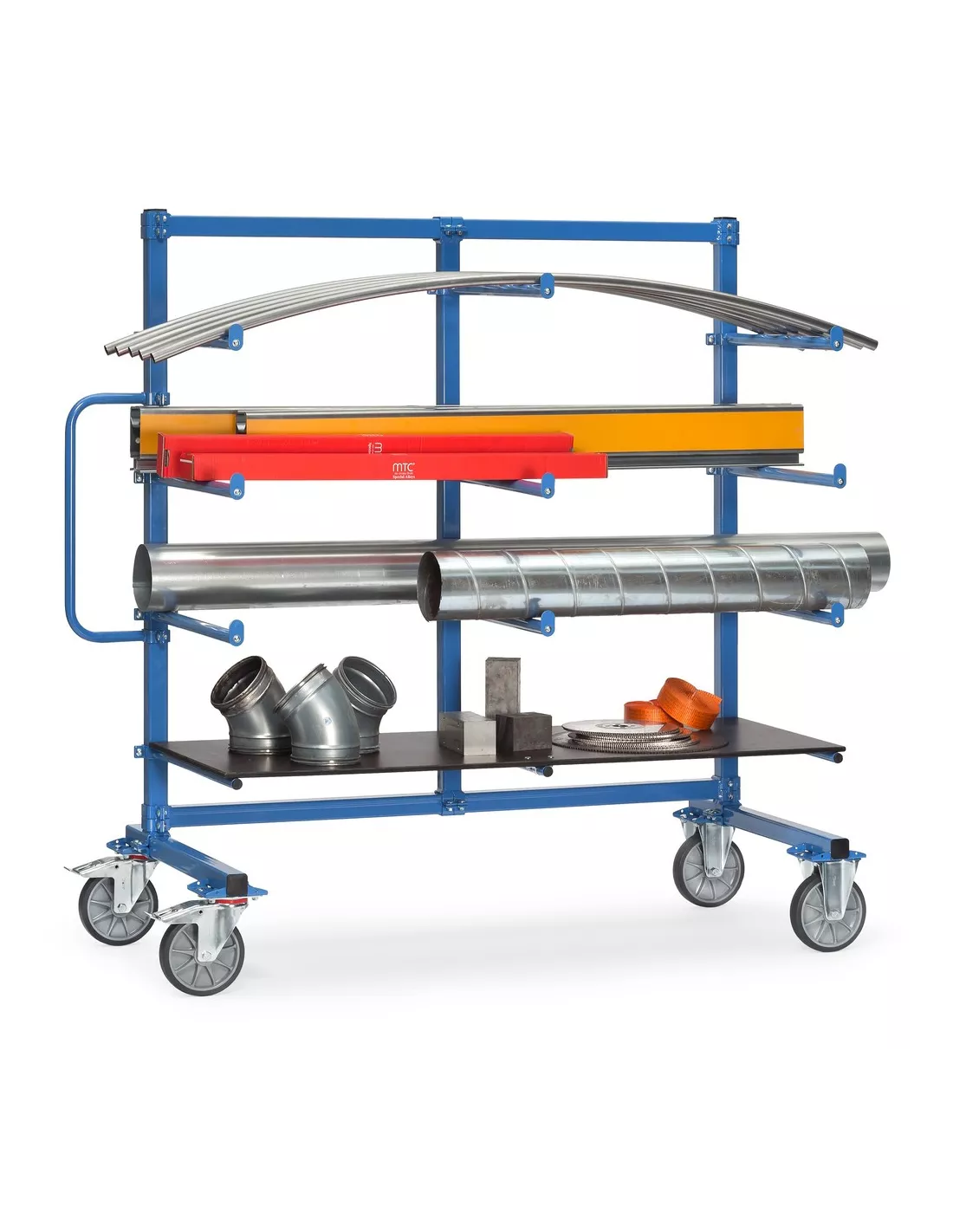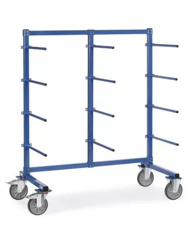 Ensemble mécano-soudé, revêtement époxy bleu RAL 5007. Système modulable pour éléments longs et stockage. Chariot complètement boulonné, barres réglables en hauteur. 1 face avec 12 barres de portée habillées d'un tube de PVC de 3 mm d'épaisseur. Longueur utile: 600 mm. 2 roues fixes et 2 roues pivotantes à bandage TPE, moyeu à roulement à billes. Freins sur roues pivotantes. Charge par étage: 80 kg.
