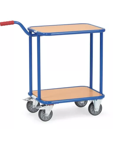 Chariot à col de cygne en tube d'acier, revêtement époxy bleu RAL 5007 avec 2 plateaux bois, poignée à boulonner, 2 roues pivotantes avec freins et 2 roues fixes à bandage TPE 125 x 32 mm, moyeu à roulement à billes central.