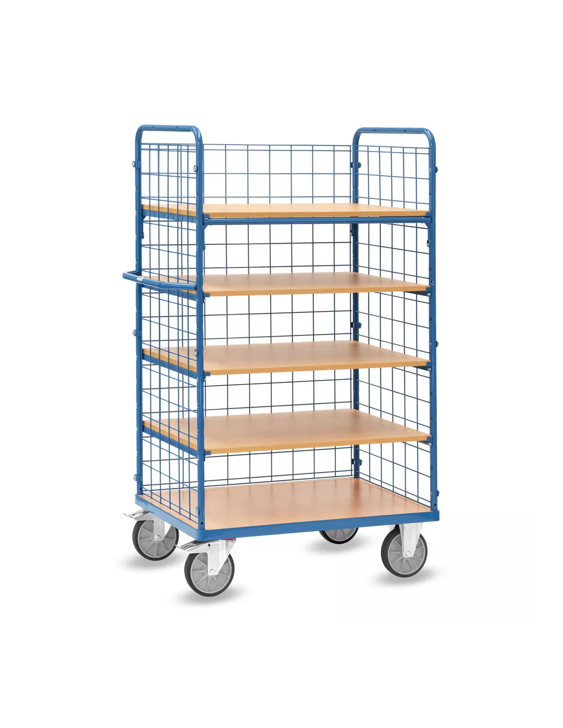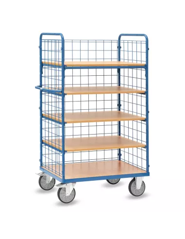 Ensemble mécano-soudé, revêtement époxy bleu RAL 5007. 1 plateau fixe et 4 amovibles en mélaminé surface effet hêtre. 2 petits et 1 grand côté avec treillis métallique 100 x 100 x 5 mm. Plateaux réglables au pas de 100 mm. Charge maximum par plateau: 90 kg. 2 roues fixes et 2 roues pivotantes à bandage TPE, moyeu à roulement à billes central. Freins sur roues pivotantes.