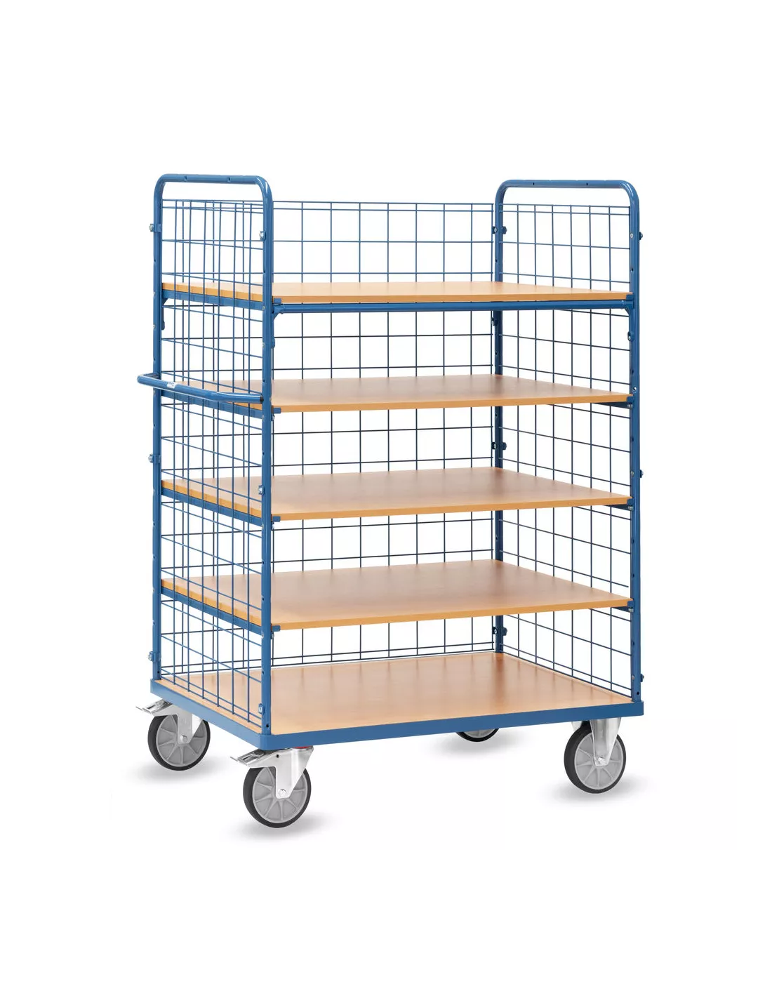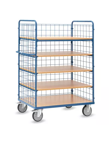 Ensemble mécano-soudé, revêtement époxy bleu RAL 5007. 1 plateau fixe et 4 amovibles en mélaminé surface effet hêtre. 2 petits et 1 grand côté avec treillis métallique 100 x 100 x 5 mm. Plateaux réglables au pas de 100 mm. Charge maximum par plateau: 90 kg. 2 roues fixes et 2 roues pivotantes à bandage TPE, moyeu à roulement à billes central. Freins sur roues pivotantes.