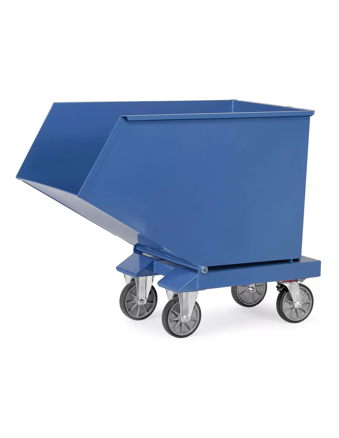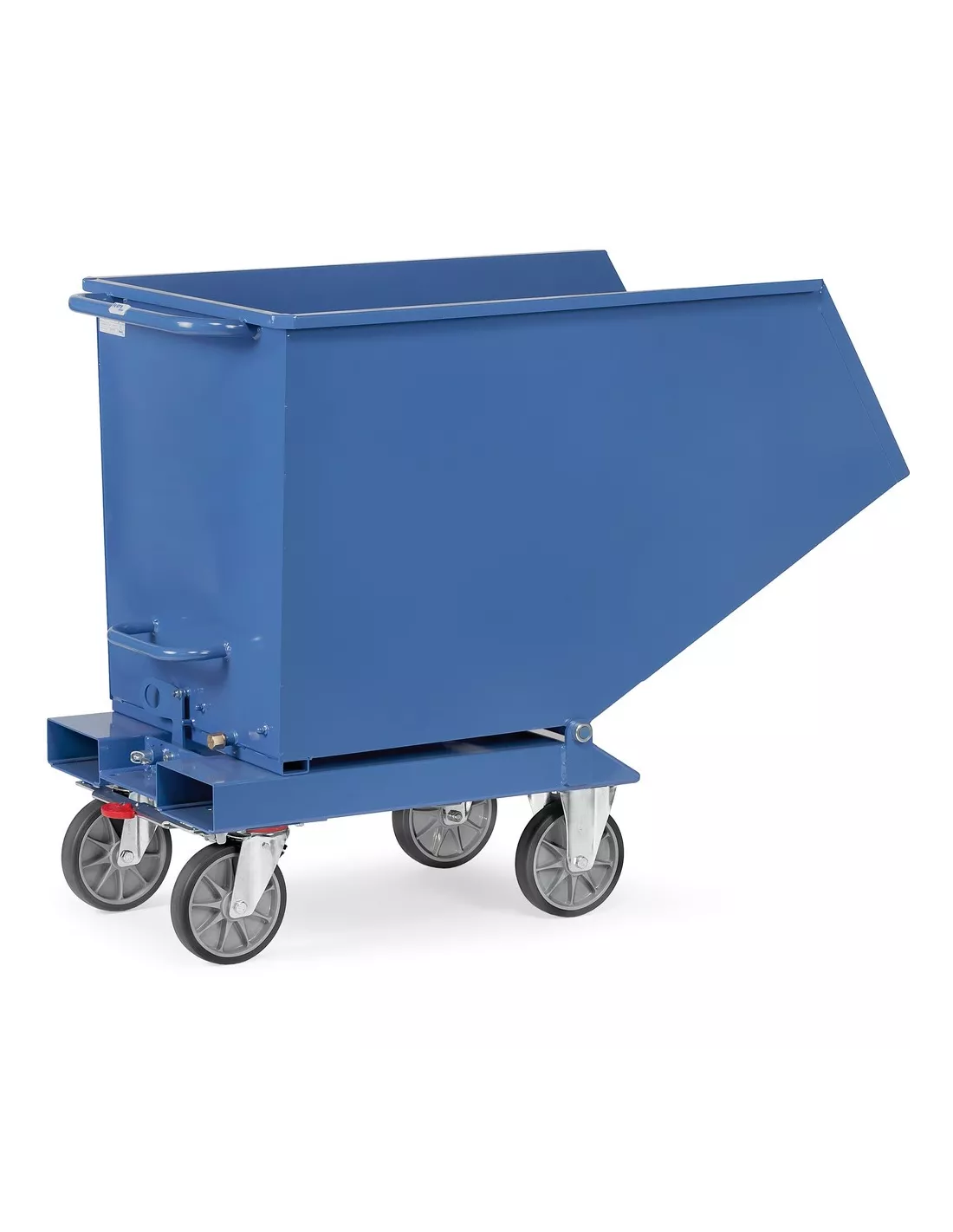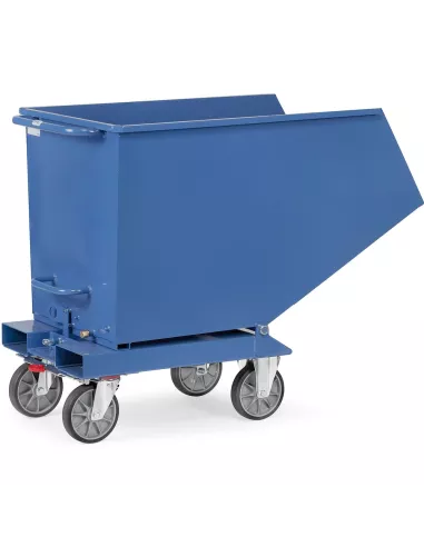 Chariot à benne basculante en tôle d'acier de 2 mm, avec bordure supérieure à double pli, étanche et mécano-soudé. Base en tôle d'acier de 3 mm avec passage de fourches. Sécurisé contre le versage accidentel, dossier de poussée en tube. Revêtement époxy bleu RAL 5007. 2 roues fixes et 2 roues pivotantes à bandage TPE. TOTALSTOP - Système de blocage centralisé de série sur les roues pivotantes. Equipée pour chariot élévateur. Sans robinet de vidange ni tamis. Le processus de basculement est déclenché manuellement. Pour le vidage avec un chariot élévateur ou en cas de chargement lourd, nous recommandons un benne basculante ou un benne auto-basculante.