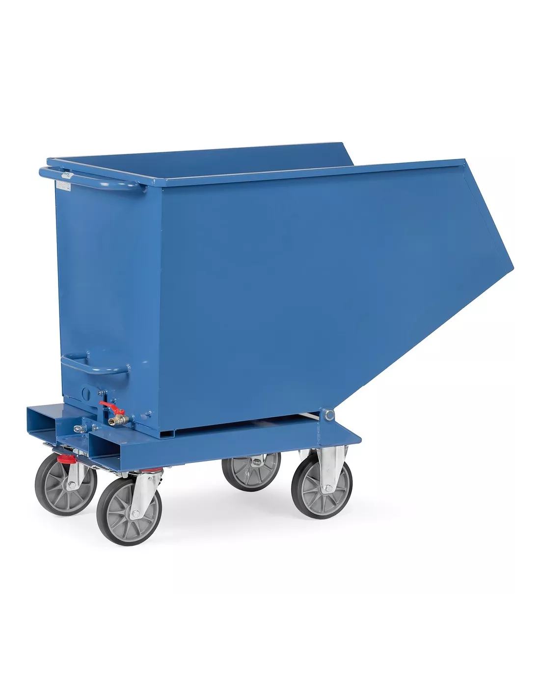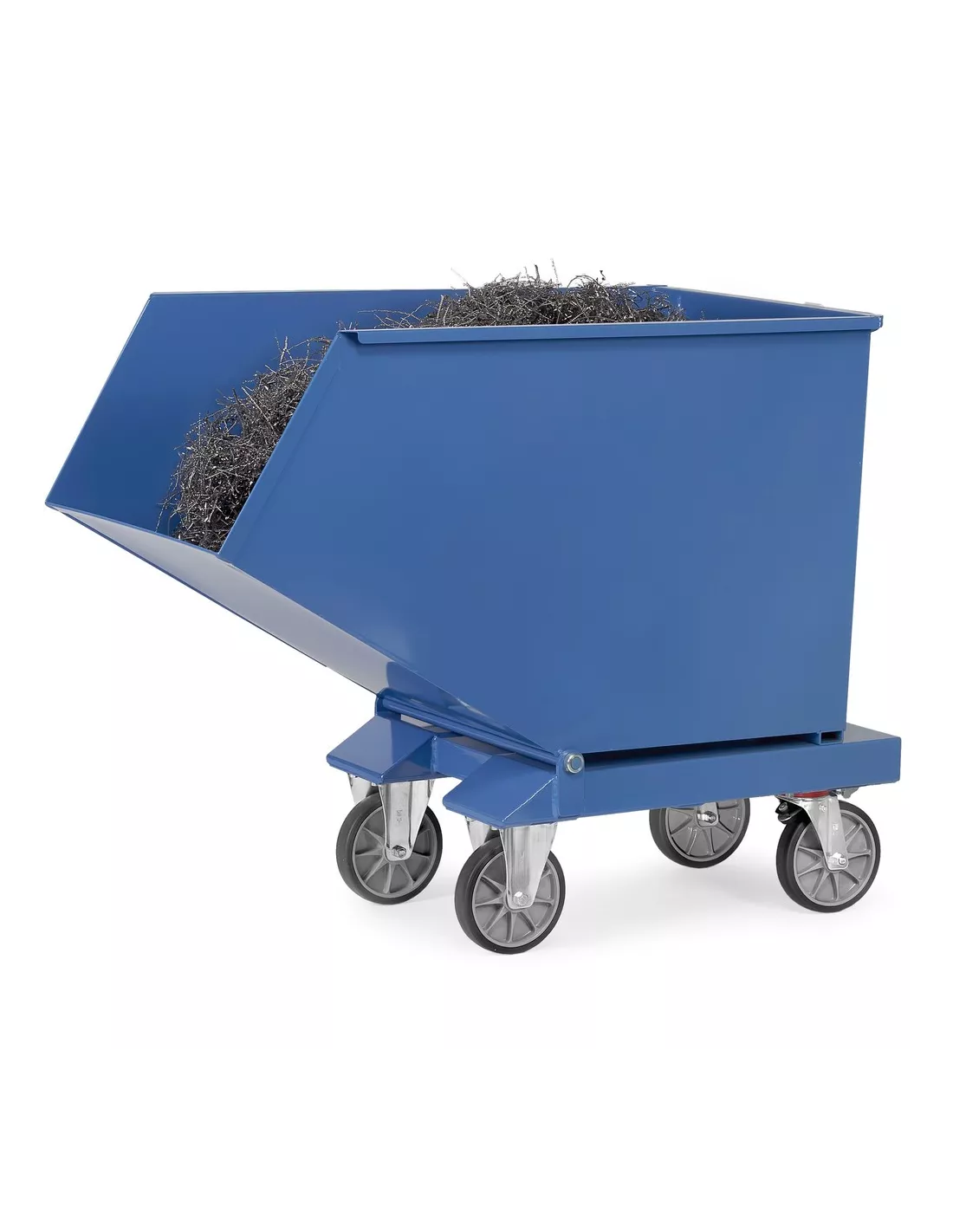 Chariot à benne basculante en tôle d'acier de 2 mm, avec bordure supérieure à double pli, étanche et mécano-soudé. Base en tôle d'acier de 3 mm avec passage de fourches. Sécurisé contre le versage accidentel, dossier de poussée en tube. Revêtement époxy bleu RAL 5007. 2 roues fixes et 2 roues pivotantes à bandage TPE. TOTALSTOP - Système de blocage centralisé de série sur les roues pivotantes. Equipée pour chariot élévateur. Avec robinet de vidange et filtre. Le processus de basculement est déclenché manuellement. Pour le vidage avec un chariot élévateur ou en cas de chargement lourd, nous recommandons un benne basculante ou un benne auto-basculante.