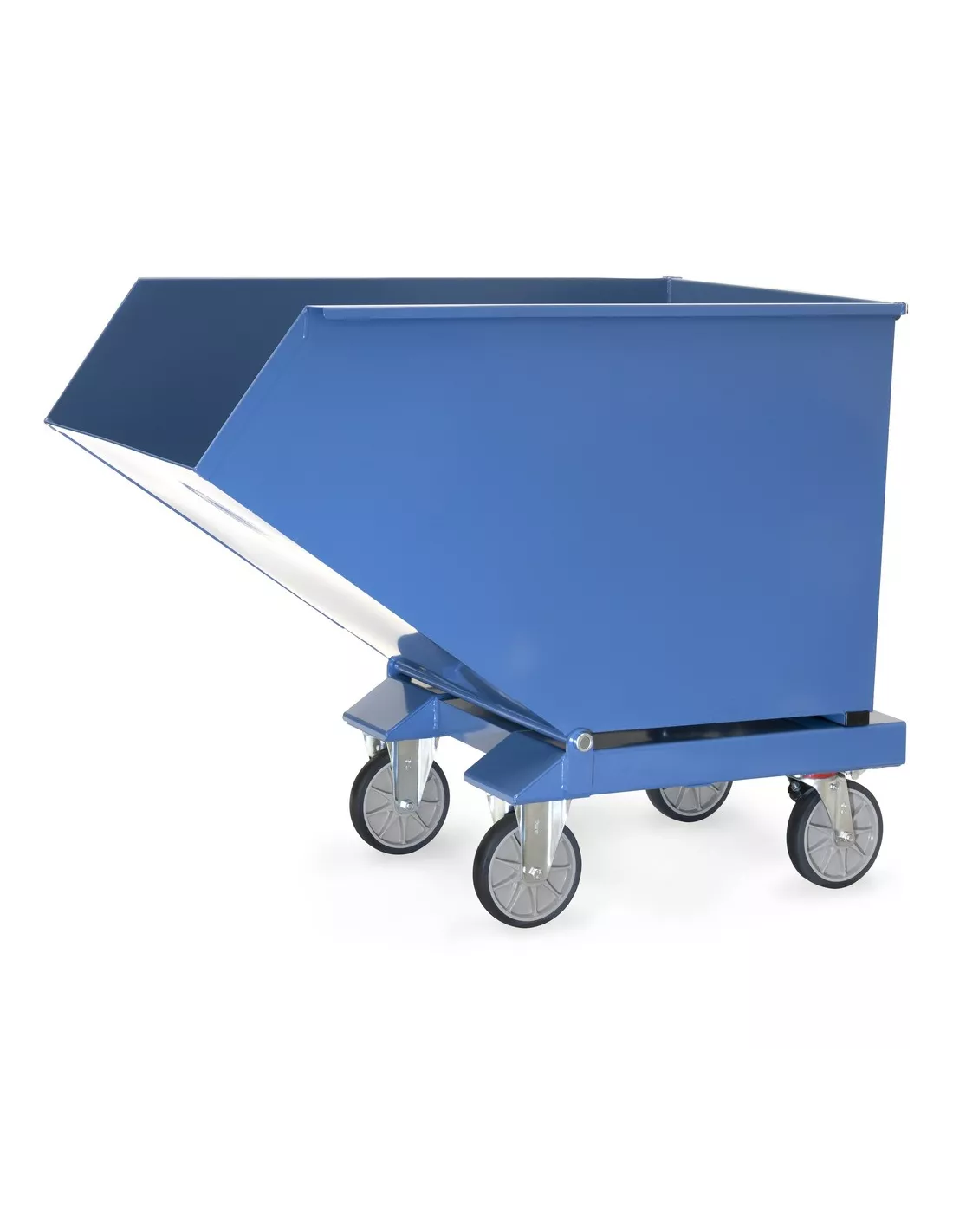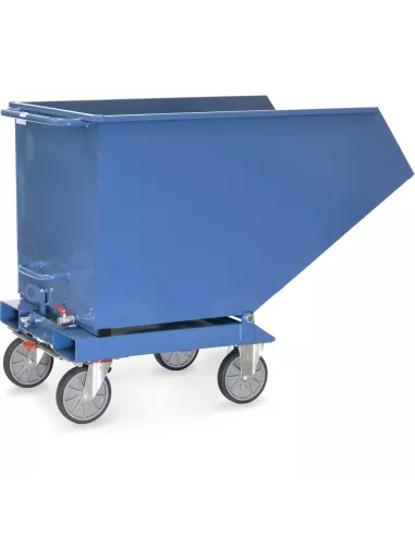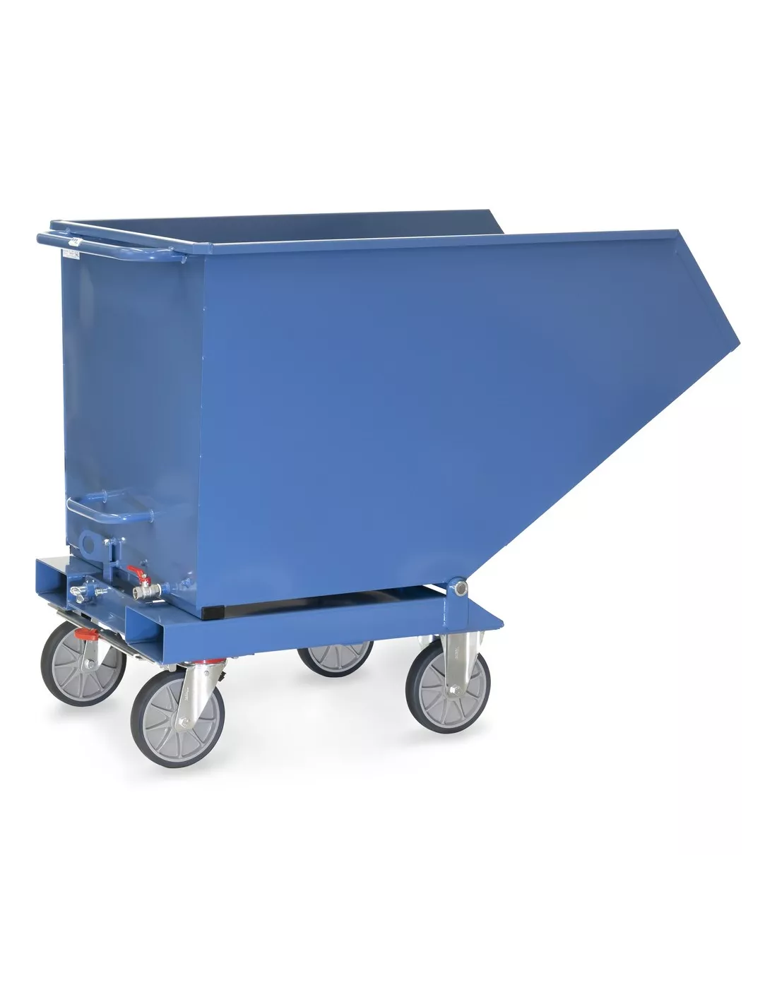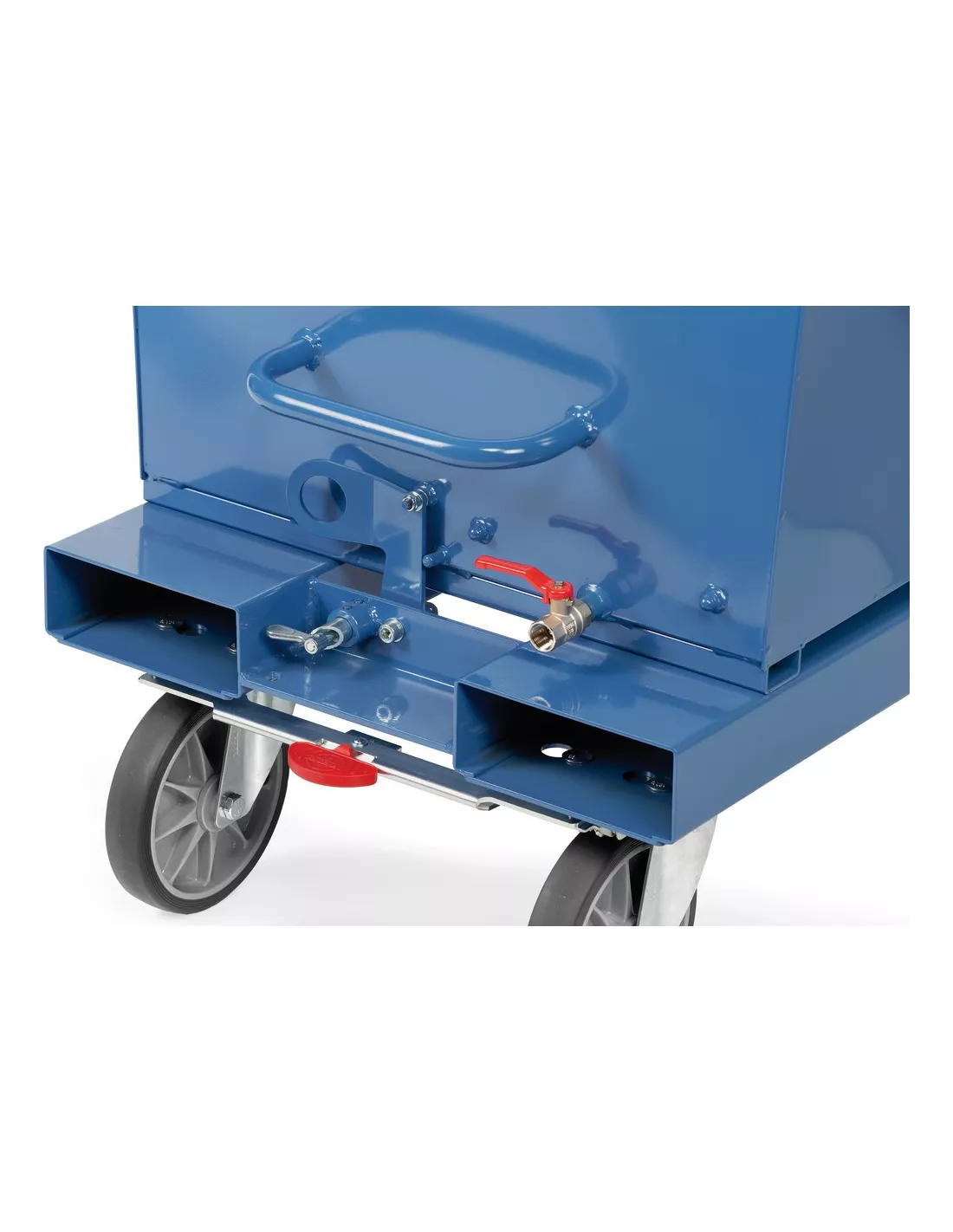 Chariot à benne basculante en tôle d'acier de 2 mm, avec bordure supérieure à double pli, étanche et mécano-soudé. Base en tôle d'acier de 3 mm avec passage de fourches. Sécurisé contre le versage accidentel, dossier de poussée en tube. Revêtement époxy bleu RAL 5007. 2 roues fixes et 2 roues pivotantes à bandage TPE. TOTALSTOP - Système de blocage centralisé de série sur les roues pivotantes. Equipée pour chariot élévateur. Avec robinet de vidange ni tamis. Le processus de basculement est déclenché manuellement. Pour le vidage avec un chariot élévateur ou en cas de chargement lourd, nous recommandons un benne basculante ou un benne auto-basculante.