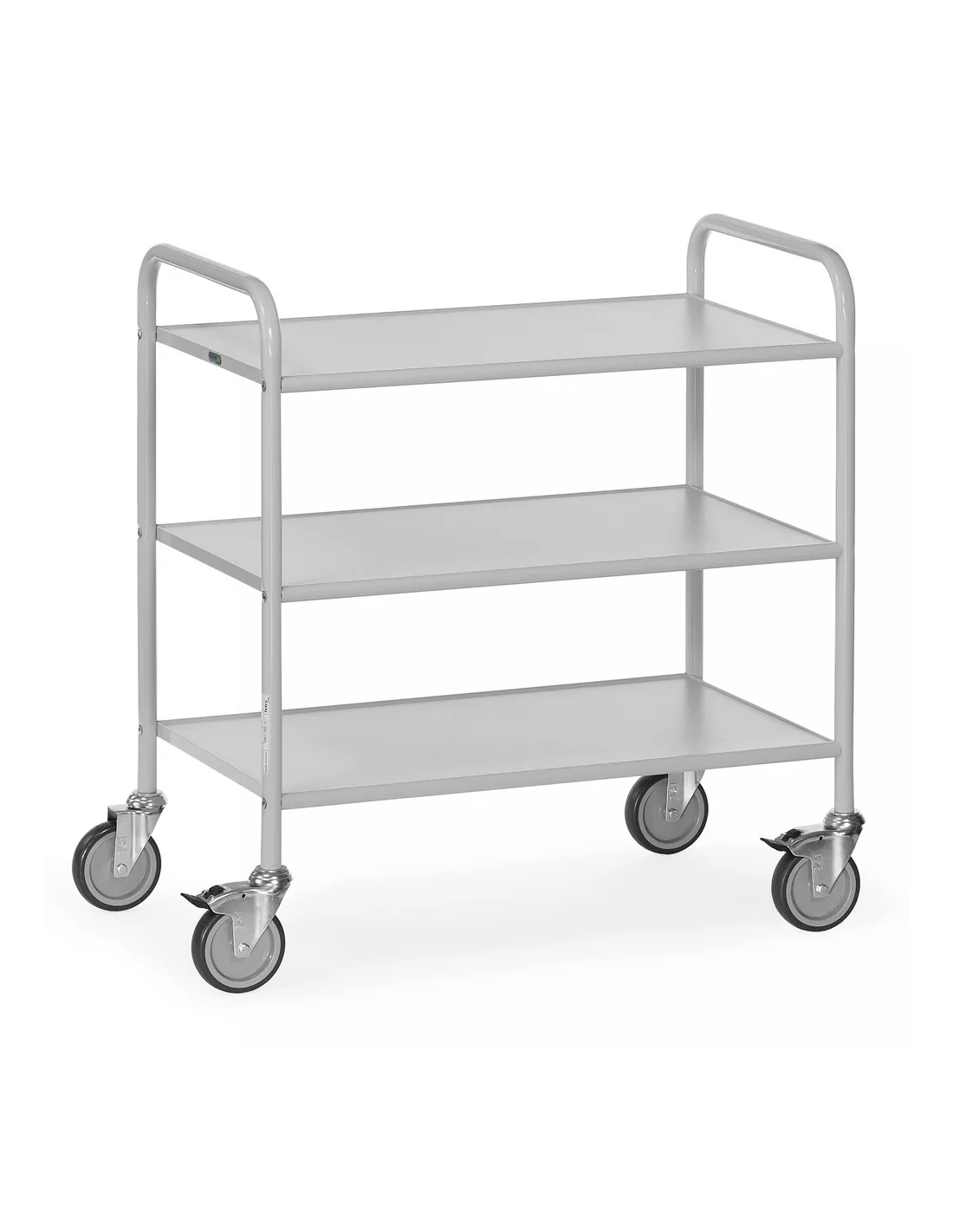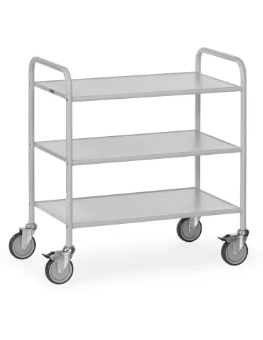 Système modulaire: construction en tube d'acier vissé, revêtement époxy gris clair RAL 7035. 3 plateaux en panneaux dérivés du bois, gris clair. 4 roues pivotantes, roues à bandage TPE, élastiques et faciles à déplacer, non traçant. Moyeu avec palier lisse. 2 roues avec freins. Livraison démontée, montage facile par l'utilisateur.