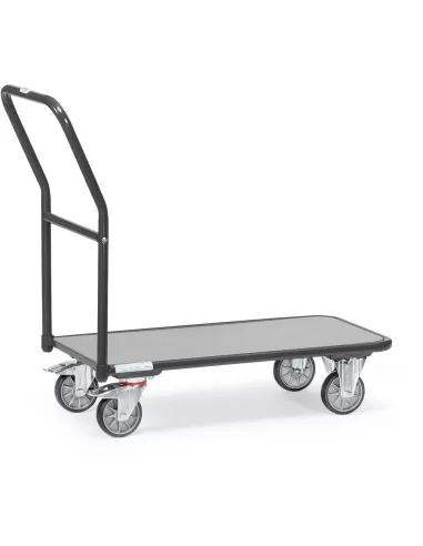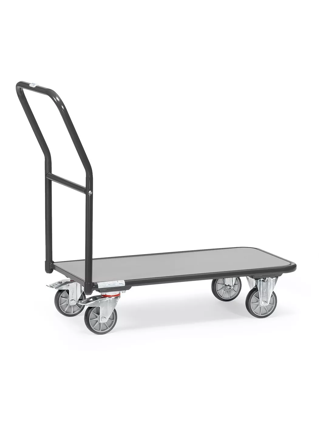 Ensemble mécano-soudé, revêtement époxy gris anthracite RAL 7016 uniquement. Plateforme en mélaminé surface gris moyen. 2 roues pivotantes et 2 roues fixes à bandage TPE 125 x 32, moyeu à roulement à billes central. Freins sur roues pivotantes.