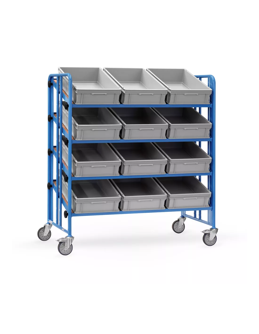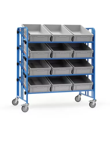Ensemble mécano-soudé, revêtement époxy bleu RAL 5007. 4 plateaux en mélaminé surface effet hêtre avec rebord de 12 mm avec 12 bacs plastiques LxlxH: 600 x 400 x 145 mm. Plateaux réglables au pas de 100 mm et inclinables de 0° à 35°. Fixation au moyen d'une molette assurant un serrage sécurisé. 4 roues pivotantes à bandage TPE, moyeu à roulement à rouleaux. 2 roues avec freins. Charge par plateau 80 kg.