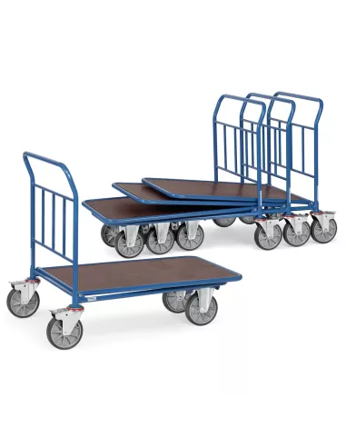 Ensemble mécano-soudé, revêtement époxy bleu RAL 5007. Plateau antidérapant plastifié et hydrofuge. Largeur 643 mm. 2 roues pivotantes et 2 roues fixes à bandage TPE, moyeu à roulement à billes central. Freins sur roues pivotantes.
