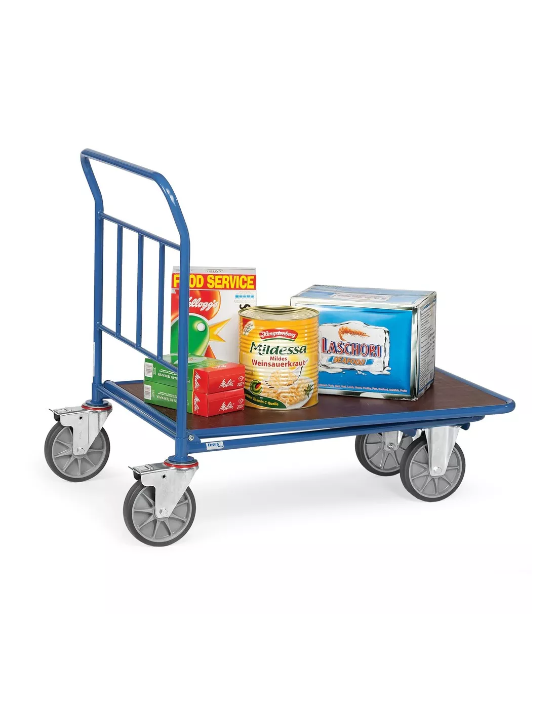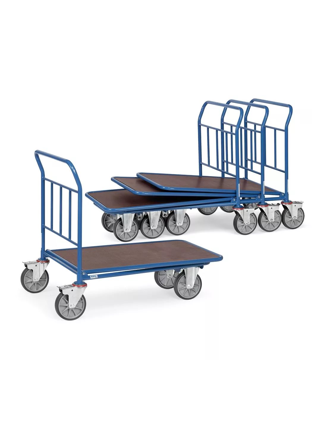 Ensemble mécano-soudé, revêtement époxy bleu RAL 5007. Plateau antidérapant plastifié et hydrofuge. Largeur 743 mm. 2 roues pivotantes et 2 roues fixes à bandage TPE, moyeu à roulement à billes central. Freins sur roues pivotantes.
