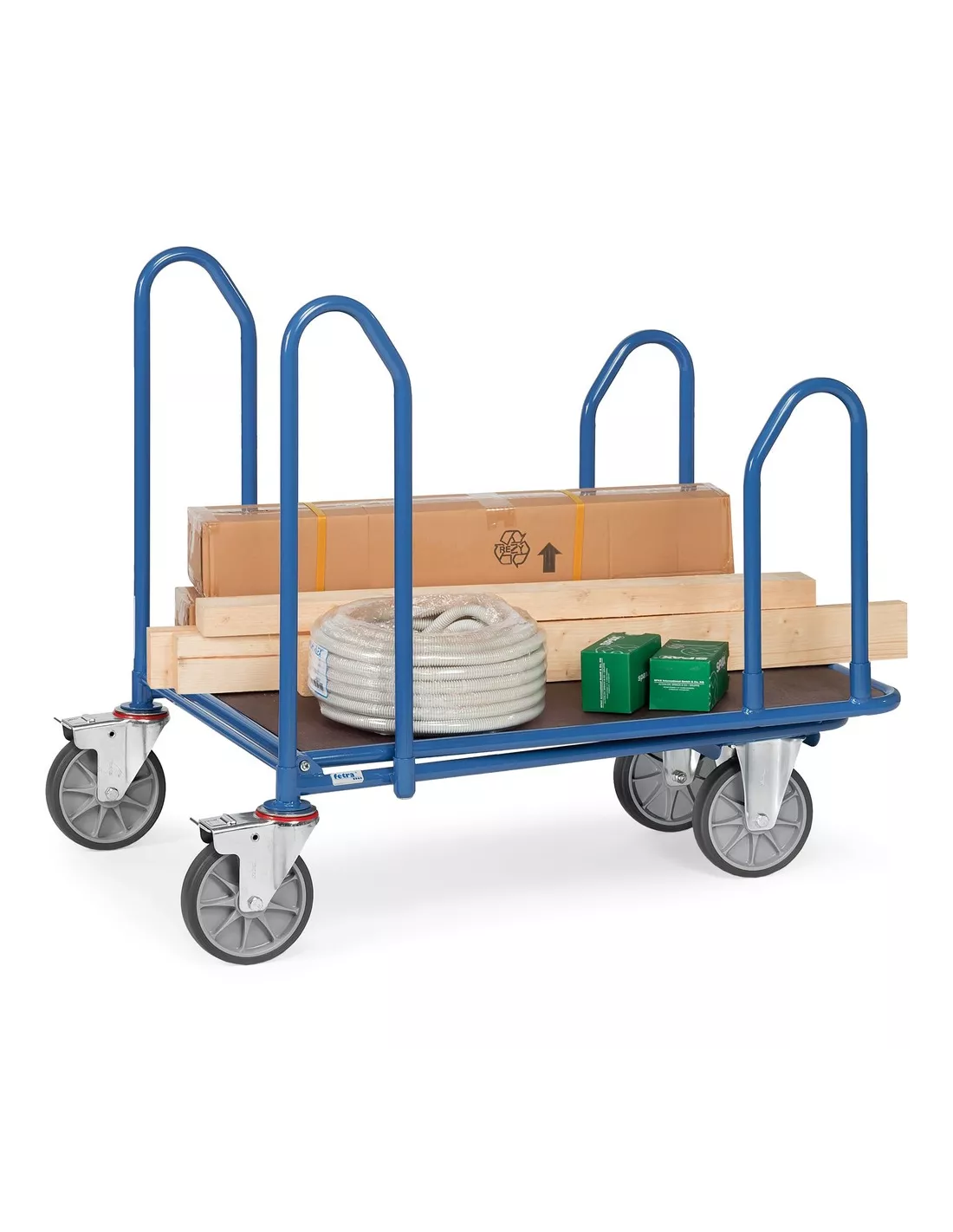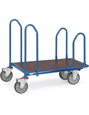 Ensemble mécano-soudé, revêtement époxy bleu RAL 5007. Plateau antidérapant plastifié et hydrofuge. A la place des dossiers, 2 arceaux hauteur 680 mm au niveau des roues pivotantes et 500 mm au niveau des roues fixes. Largeur 743 mm. 2 roues pivotantes et 2 roues fixes à bandage TPE, moyeu à roulement à billes central. Freins sur roues pivotantes.