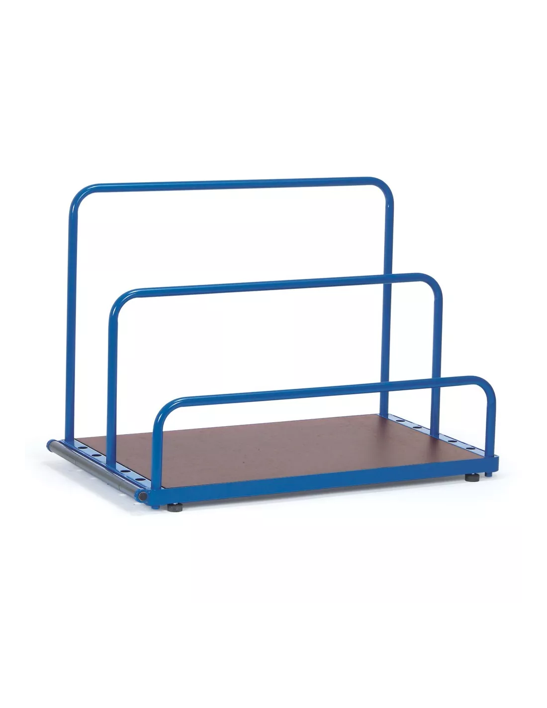 En profilé et tube d'acier mécano-soudés, revêtement époxy. Plateau en contreplaqué hydrofuge et antidérapant. 7 compartiments. 4 pieds réglables. 6 rouleaux sur petit côté, aide au rangement des panneaux. Largeur des compartiments 90 mm. Accessoire pour porte-panneaux pied de 100 mm pour permettre le passage de fourches. Livraison sans tubes cintrés.