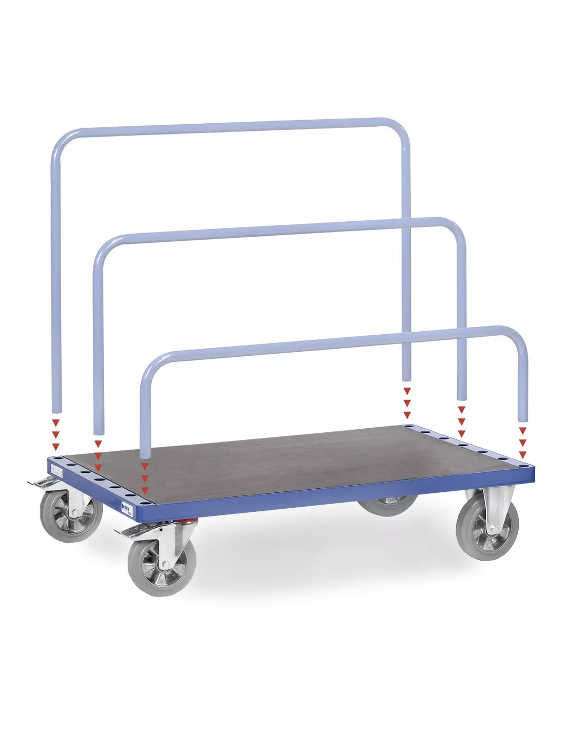 Ensemble mécano-soudé, revêtement époxy, plateforme en bois. 7 positions pour insérer des ridelles tubulaires distantes de 90 mm. 2 roues fixes et 2 roues pivotantes à bandage caoutchouc élastique bleu-gris non traçant, moyeu à roulement à billes. Freins sur roues pivotantes. Livré sans tubes cintrés.