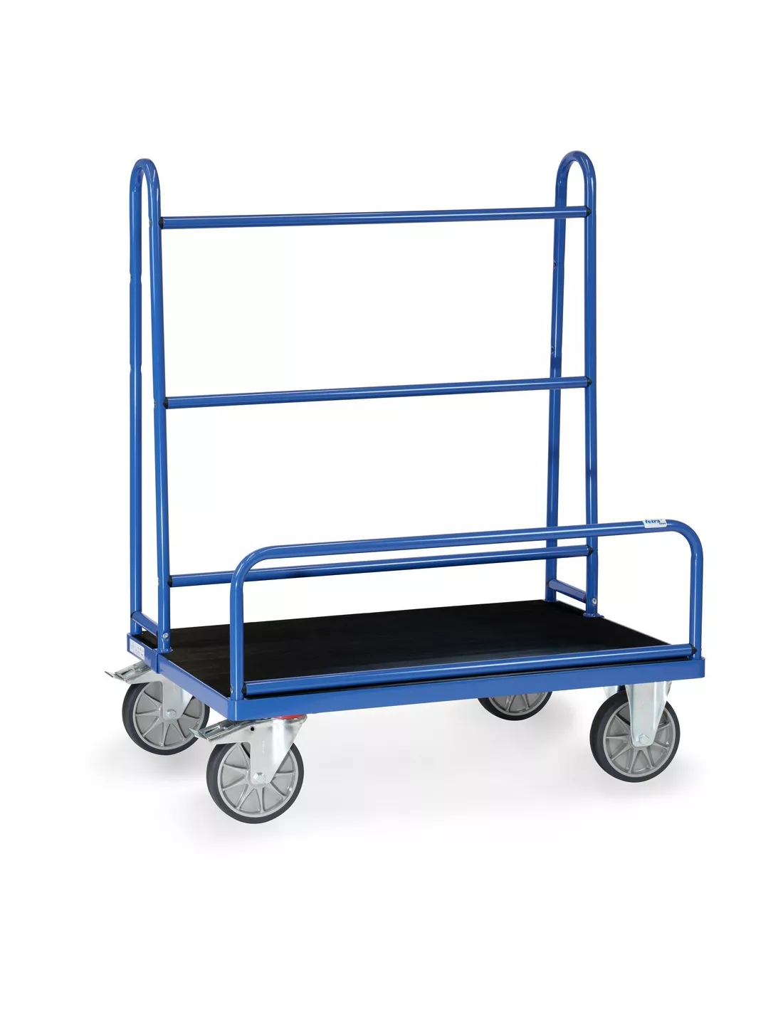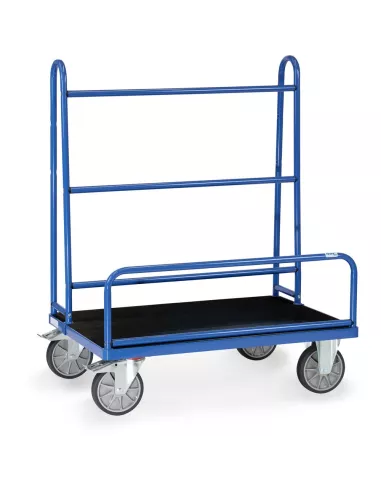 Ensemble mécano-soudé, revêtement époxy bleu RAL 5007. Plateforme en mélaminé surface avec revêtement caoutchouc. Armature en tôle d'acier à boulonner. 2 roues fixes et 2 roues pivotantes à bandage TPE, moyeu à roulement à billes. Freins sur roues pivotantes. Hauteur utile: 1 050 mm. Hauteur du tube cintré d'arrêt: 300 mm.