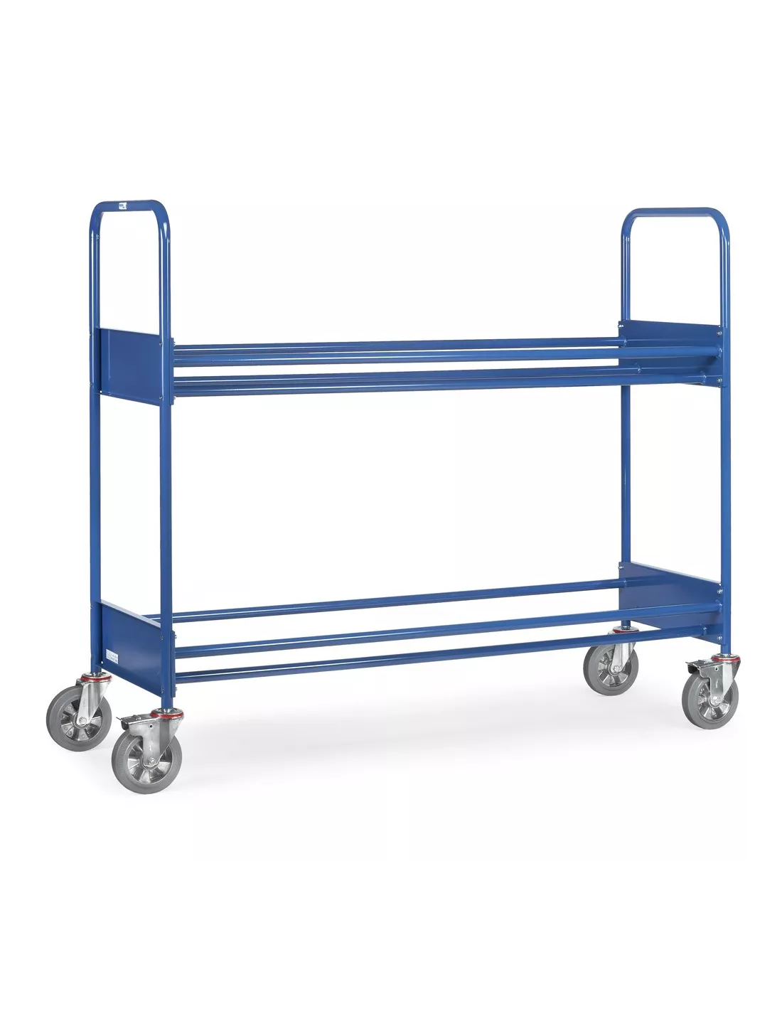 Construction en tube d'acier renforcé, revêtement époxy bleu RAL 5007. Support de pneumatiques supérieur réglable au pas de 75 mm avec ridelle en tôle d'acier. Convient pour une utilisation plus intensive comme par exemple dans les box des écuries de voitures de courses. 4 roues pivotantes à bandage caoutchouc élastique bleu gris non traçant, moyeu à roulement à billes. 2 roues avec freins.