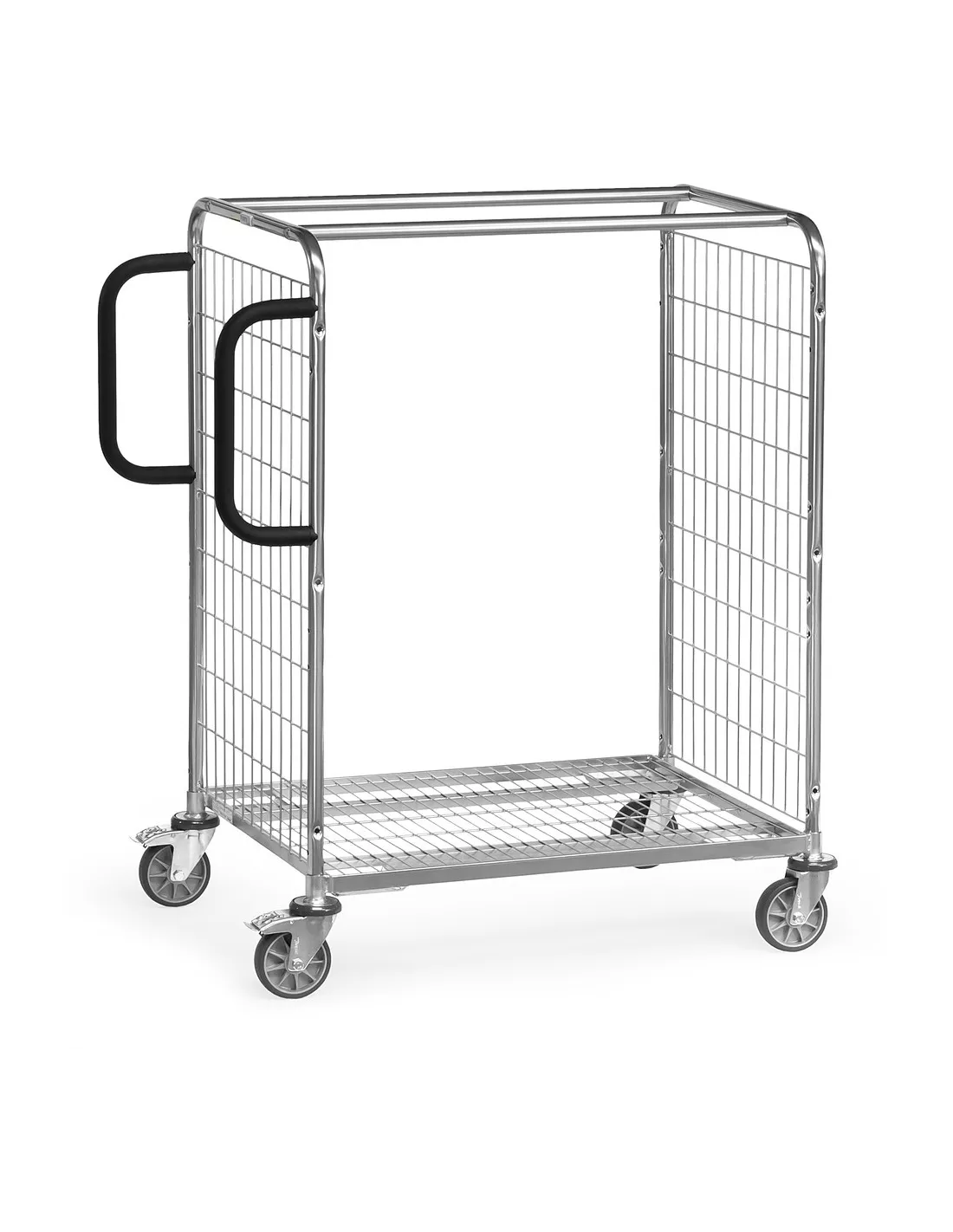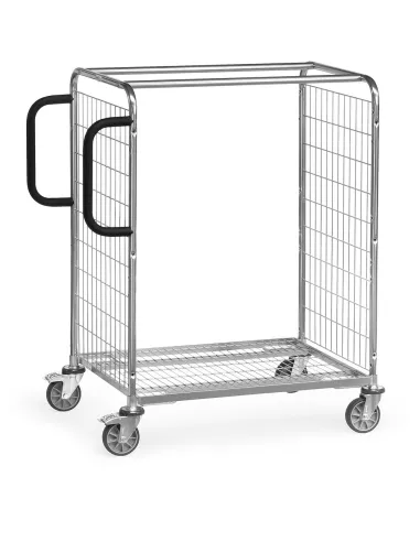 En kit selon le principe des «inserts» fetra construction en profilé et tube d'acier entièrement galvanisé. Ridelles en tube avec habillage en treillis métallique avec mailles de 100 x 50 mm, renforcées par 2 barres transversales. Plateau et châssis avec armature en profilé et habillage en treillis avec maille de 123 x 30 mm 2 poignées verticales boulonnées de chaque côté de la ridelle. 4 roues pivotantes à bandage TPE sur jantes en plastique, moyeu à roulement à billes. Freins sur 2 roues. 4 protections antichocs en TPU (Polyuréthane thermoplastique) au-dessus des roues pivotantes.