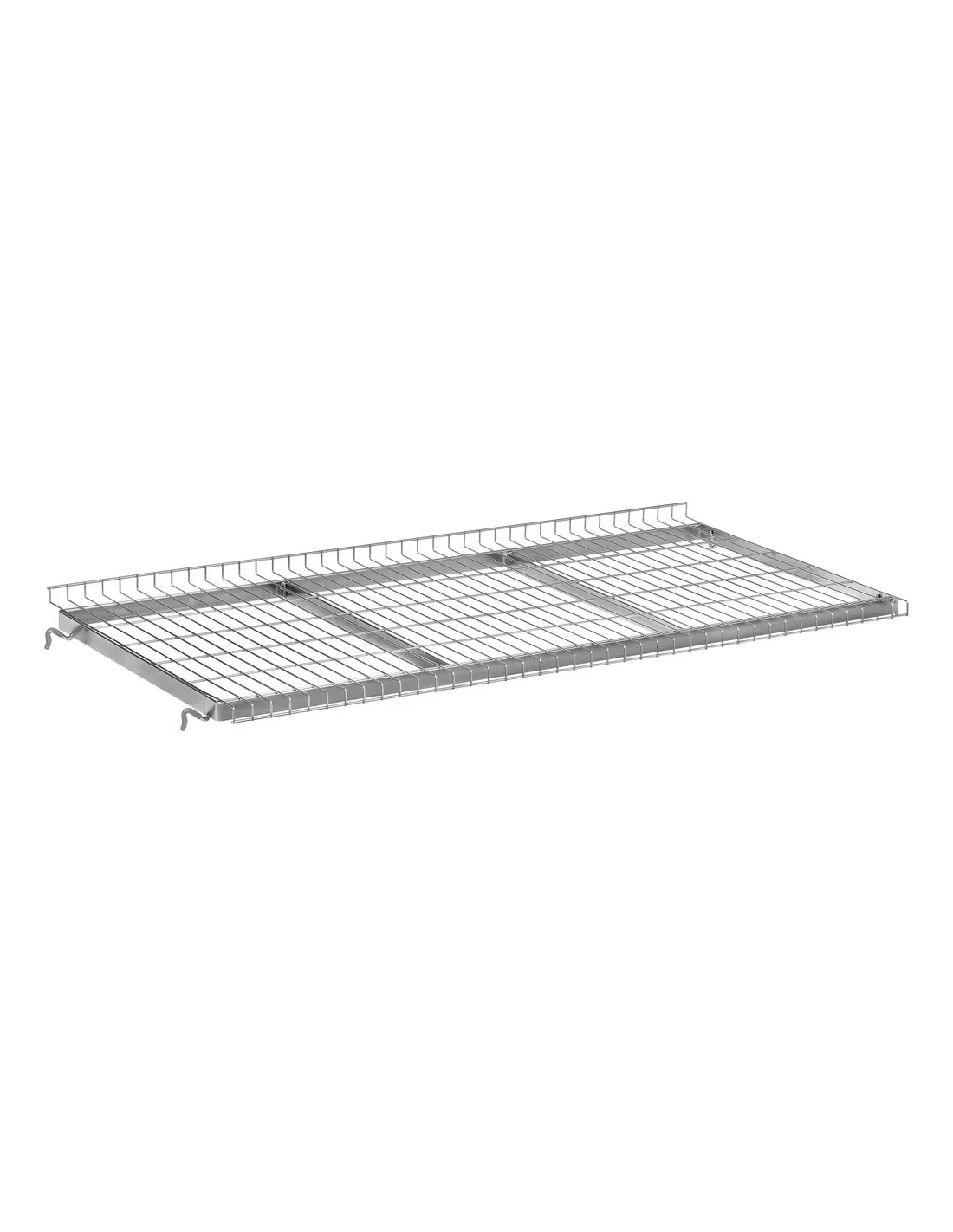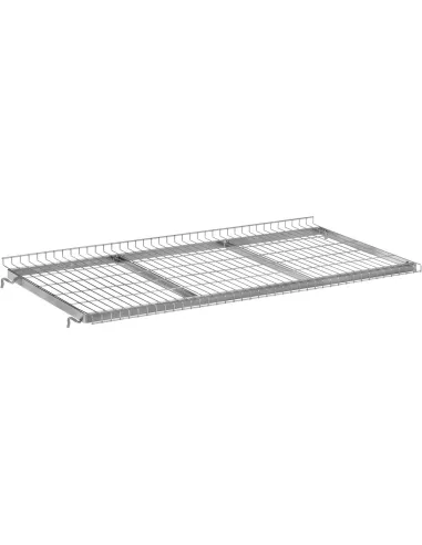 Plateau en treillis avec maillage 120 x 30 mm, galvanisé, avec rebord de 23 mm sur 1 grand côté cintrage vers le bas de 23 mm de l'autre côté. Réglable et inclinable au pas de 100 mm. Charge de 80 kg selon modèle.