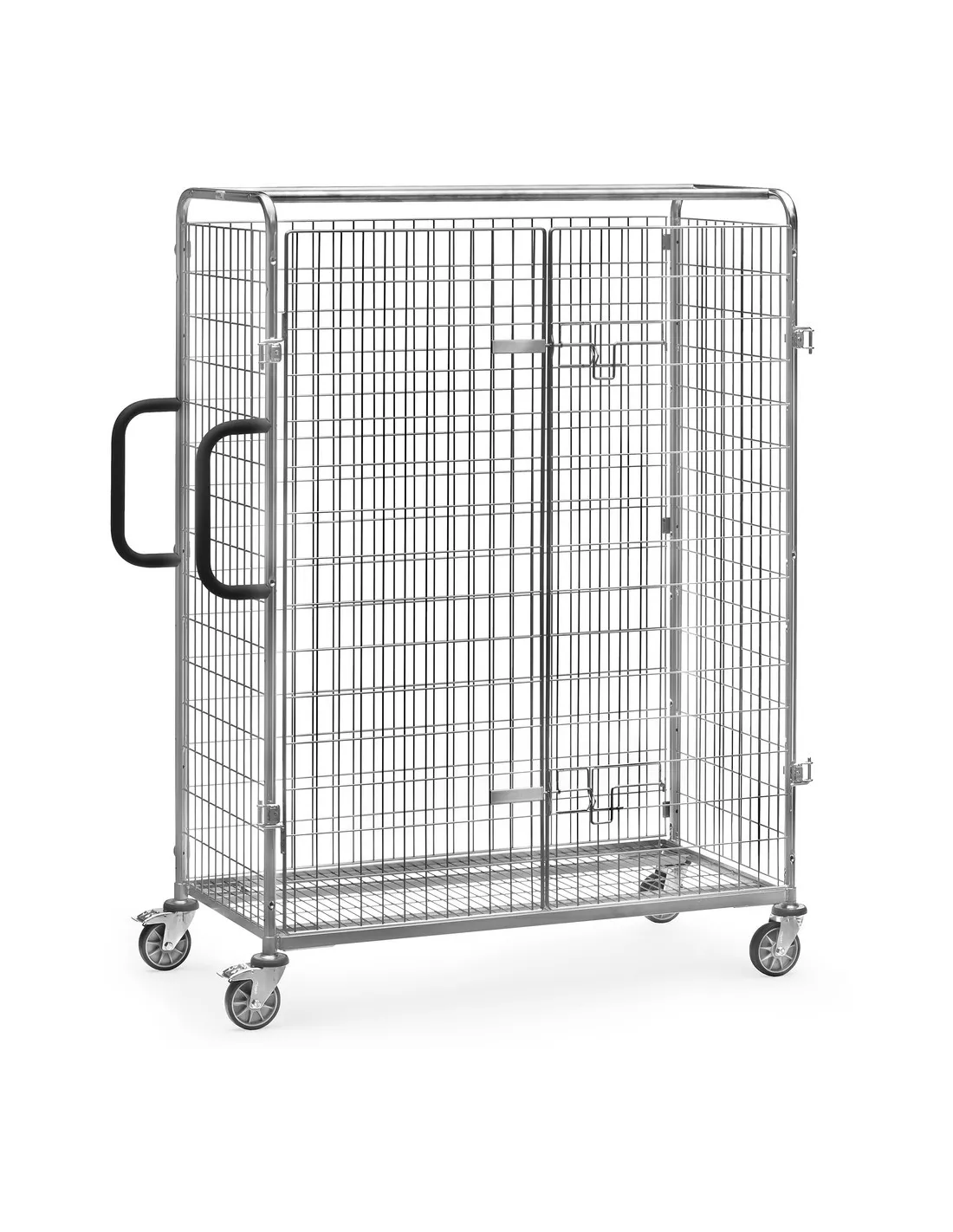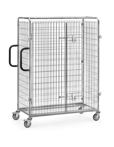 Double-portes battantes. Treillis galvanisé, maille de 100 x 50 mm, charnières à boulonner, la porte peut se rabattre à 180° vers le corps du chariot, 2 loquets en fil zingué verrouillables par cadenas (Cadenas non fourni).