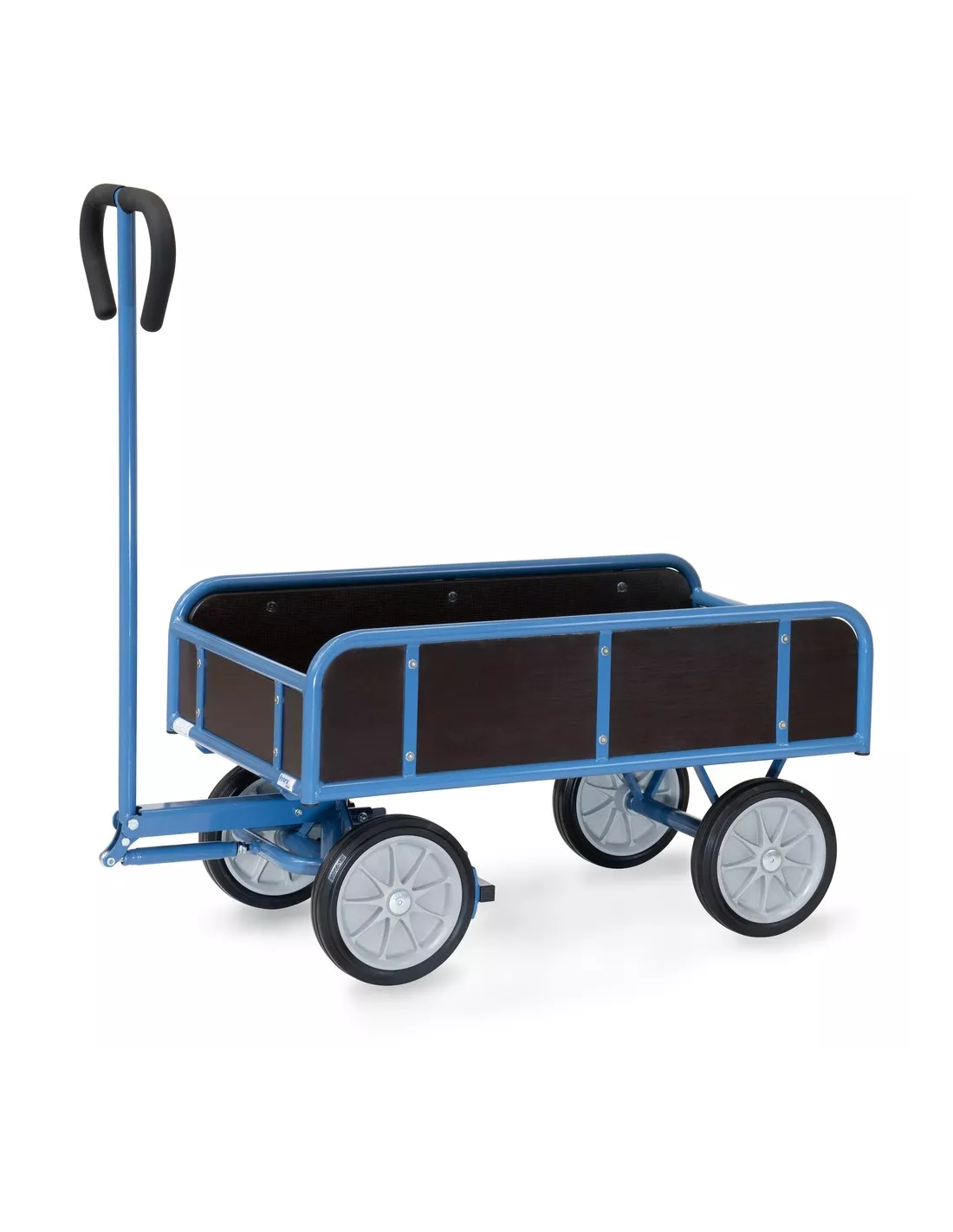 En tube d'acier soudé, revêtement époxy bleu RAL 5007. Ridelles hauteur 250 mm, Plateau et ridelles en contreplaqué hydrofuge. Essieu avec timon. Roues à bandage caoutchouc, moyeu à roulement à rouleaux. Poignée sécurisée avec revêtement souple remontant automatiquement en position verticale. Blocage automatique de l'essieu avant.