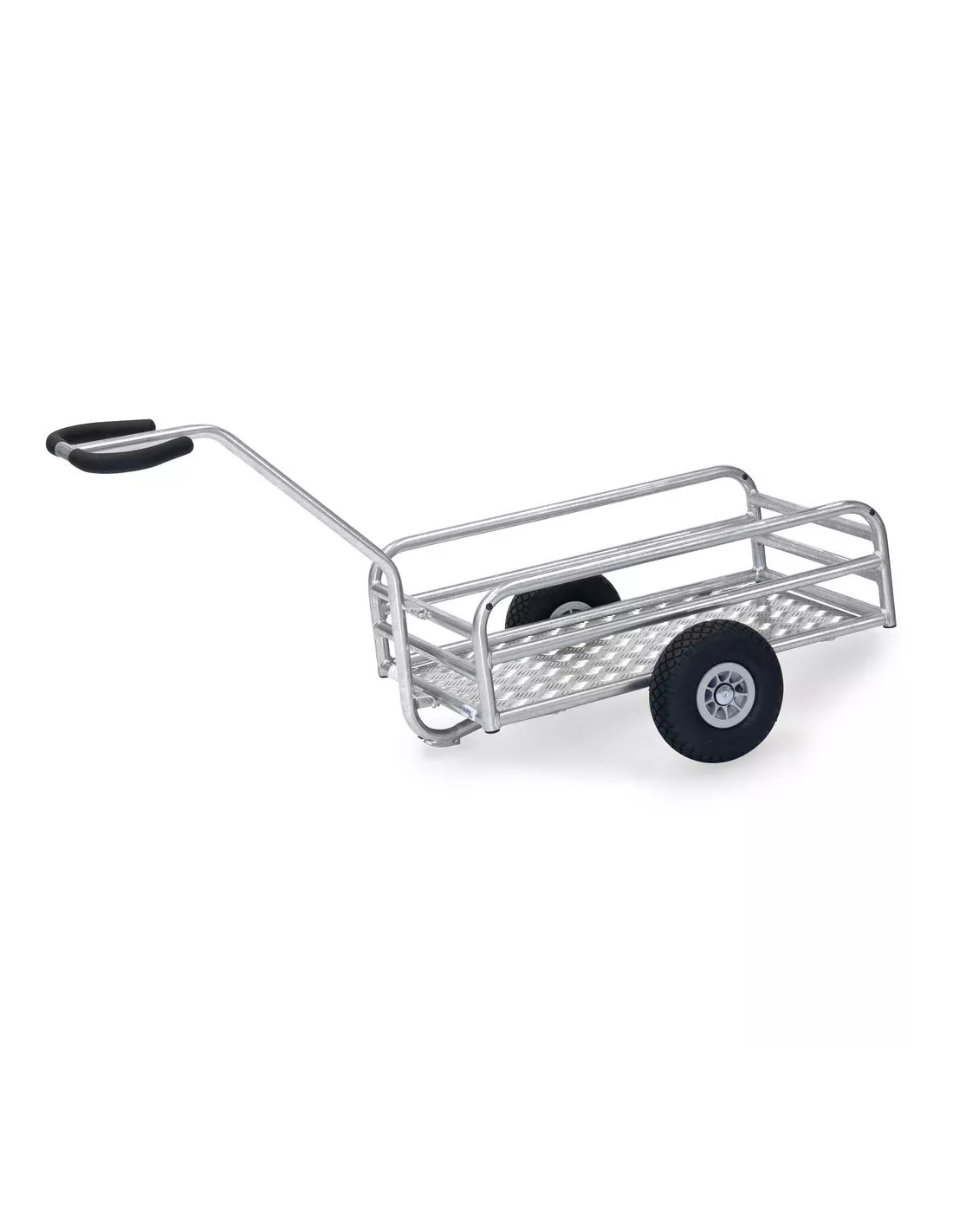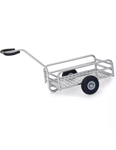 Chars à bras léger pour une utilisation en extérieur, en tube d’acier soudé, galvanisé, plateforme en tôle alu larmé, tubulure renforcée hauteur 180/250 mm. Timon sécurisé  boulonné avec revêtement  souple. Grandes roues gonflables, moyeu à roulement à rouleaux, fixation des roues par vis pour faciliter le remplacement.