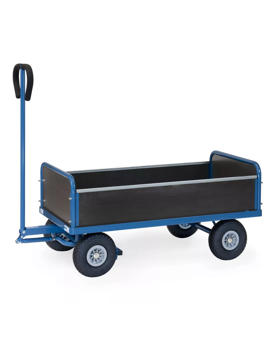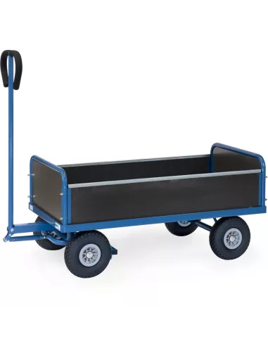 En tube d'acier soudé, revêtement époxy bleu RAL 5007. Avec 2 ridelles sur petit côté hauteur 300 mm et 2 sur grand côté amovibles hauteur 220 mm, avec plateau en contreplaqué. Essieu avec timon et poignée. Roues en mousse polyuréthane increvables, moyeu à roulement à rouleaux. Poignée sécurisée avec revêtement souple remontant automatiquement en position verticale. Blocage automatique de l'essieu avant.