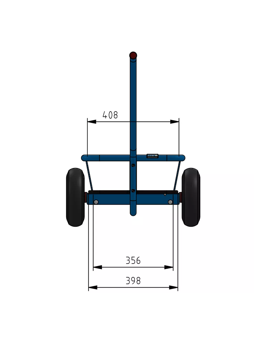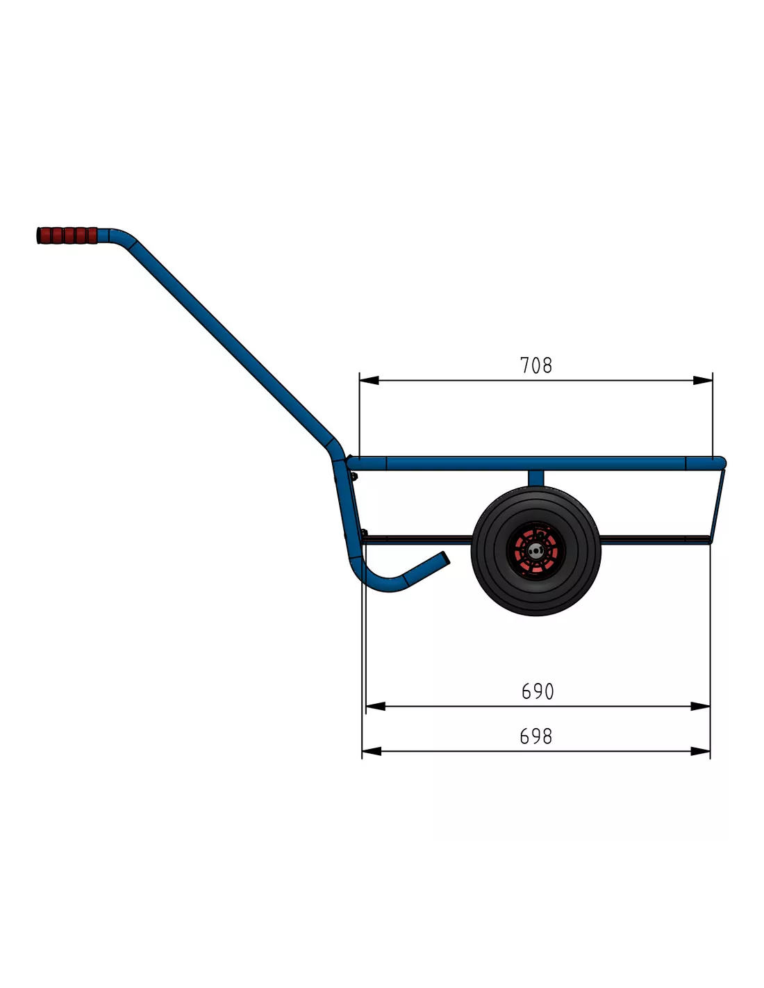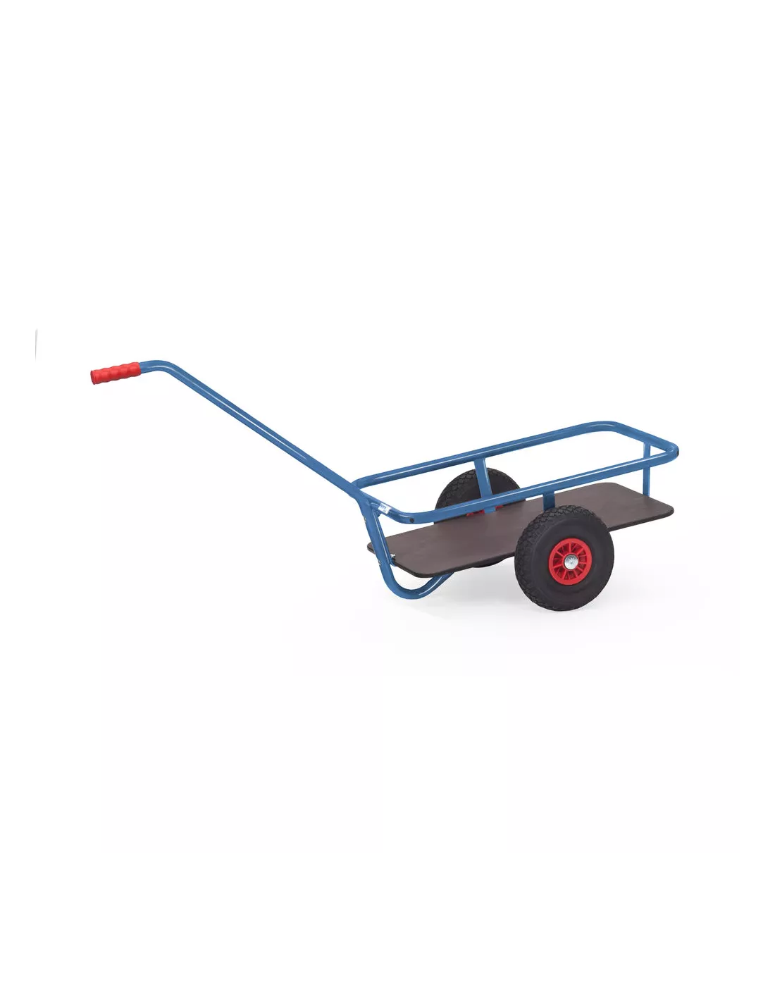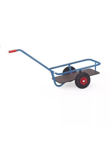 Char à bras léger en tube et profilé d'acier soudés, revêtement époxy bleu RAL 5007. Timon à boulonner. Plateau en contreplaqué hydrofuge. Roues en mousse polyuréthane increvables, moyeu à roulement à billes. Livré non monté, montage facile.