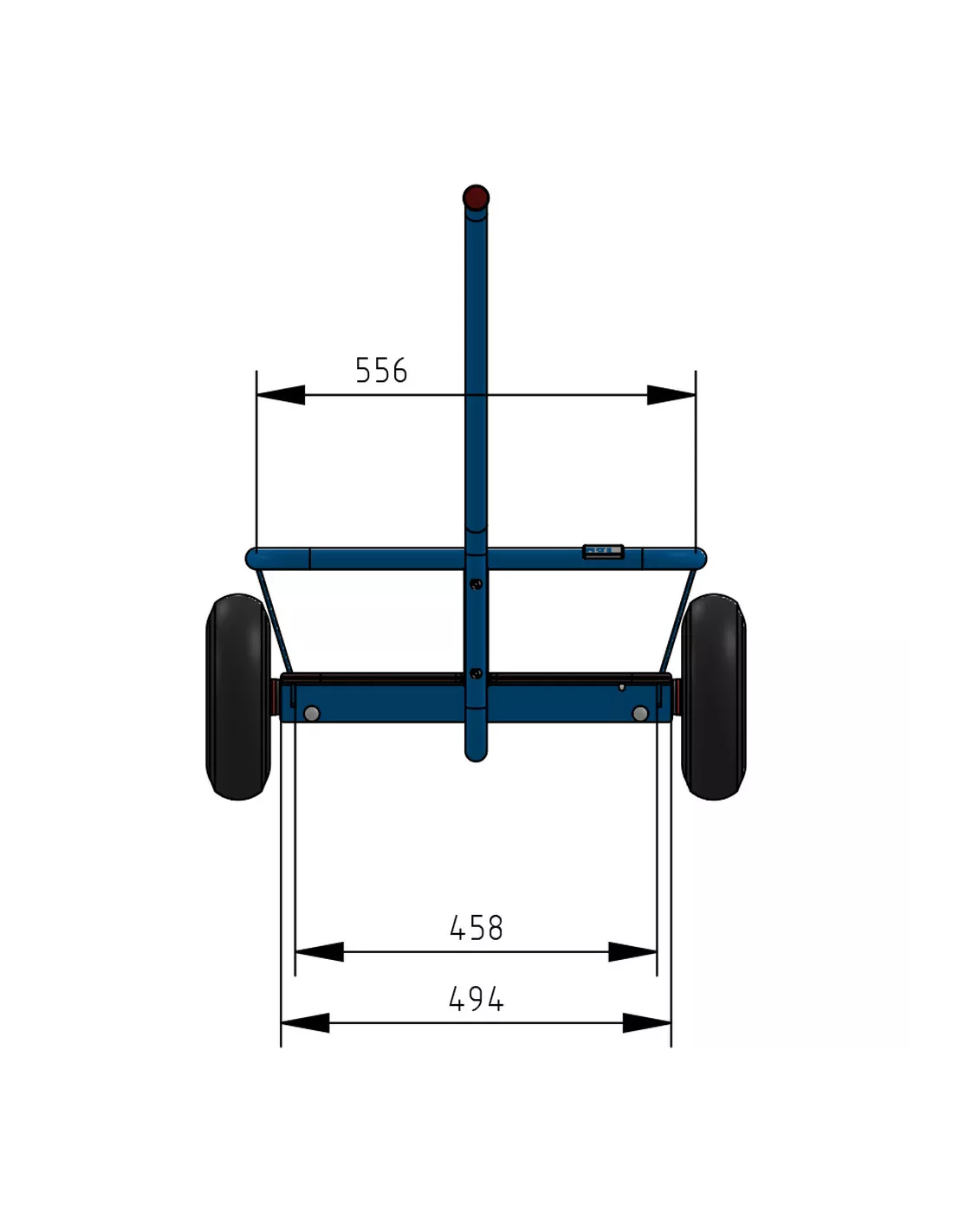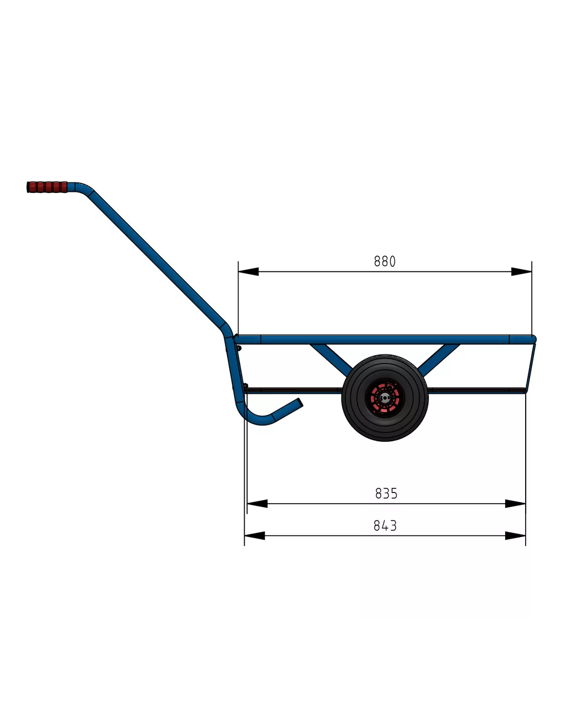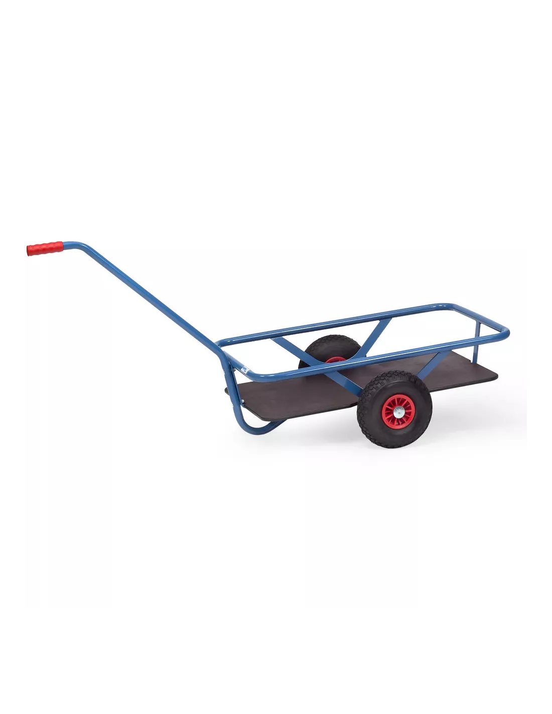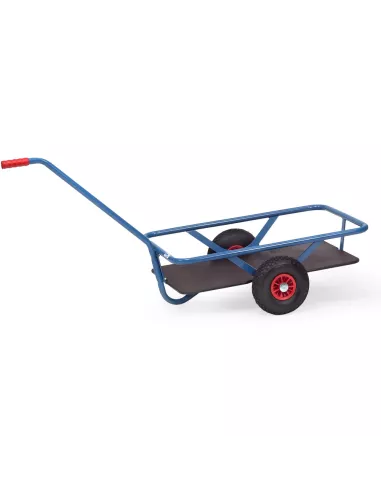 Char à bras léger en tube et profilé d'acier soudés, revêtement époxy bleu RAL 5007. Timon à boulonner. Plateau en contreplaqué hydrofuge. Roues en mousse polyuréthane increvables, moyeu à roulement à billes. Livré non monté, montage facile.