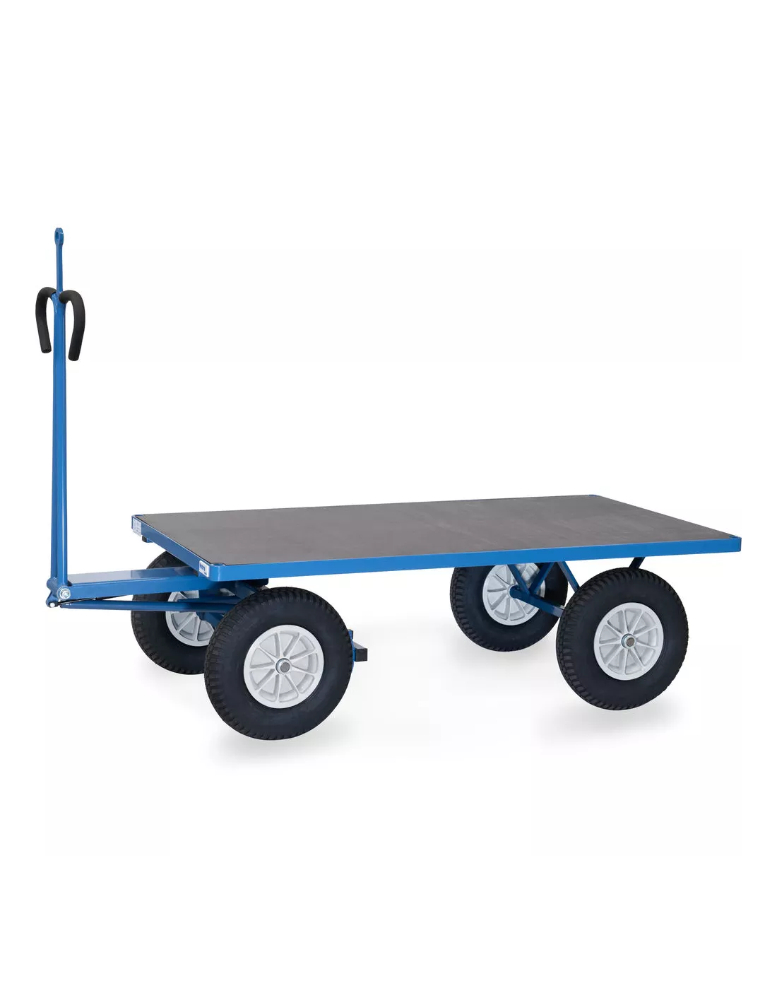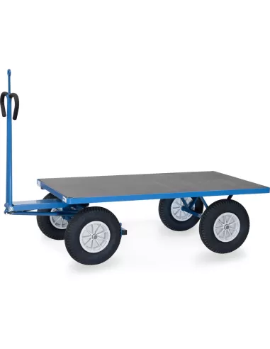 Ensemble mécano-soudé, revêtement époxy bleu RAL 5007. 4 inserts dans les angles, essieu sur rond à billes, timon en triangle avec poignée avec revêtement en plastique sécurisée remontant automatiquement en position verticale. Avec oeillet de traction, Ø interne 32 mm. Plateau en contreplaqué avec revêtement antidérapant et hydrofuge. Roues en mousse polyuréthane increvables, moyeu à roulement à rouleaux. Freinage automatique sur essieu avant.