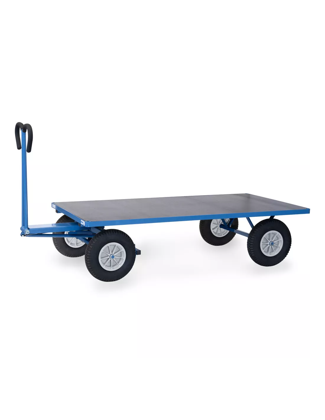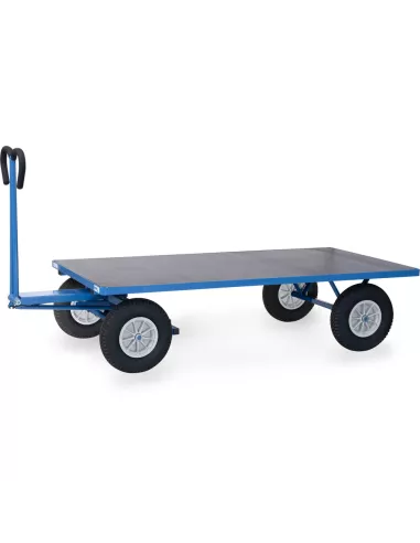 Ensemble mécano-soudé, revêtement époxy bleu RAL 5007. 4 inserts dans les angles, essieu sur rond à billes, timon en triangle avec poignée avec revêtement en plastique sécurisée remontant automatiquement en position verticale. Plateau en contreplaqué avec revêtement antidérapant et hydrofuge. Roues en mousse polyuréthane increvables, moyeu à roulement à rouleaux. Freinage automatique sur essieu avant.
