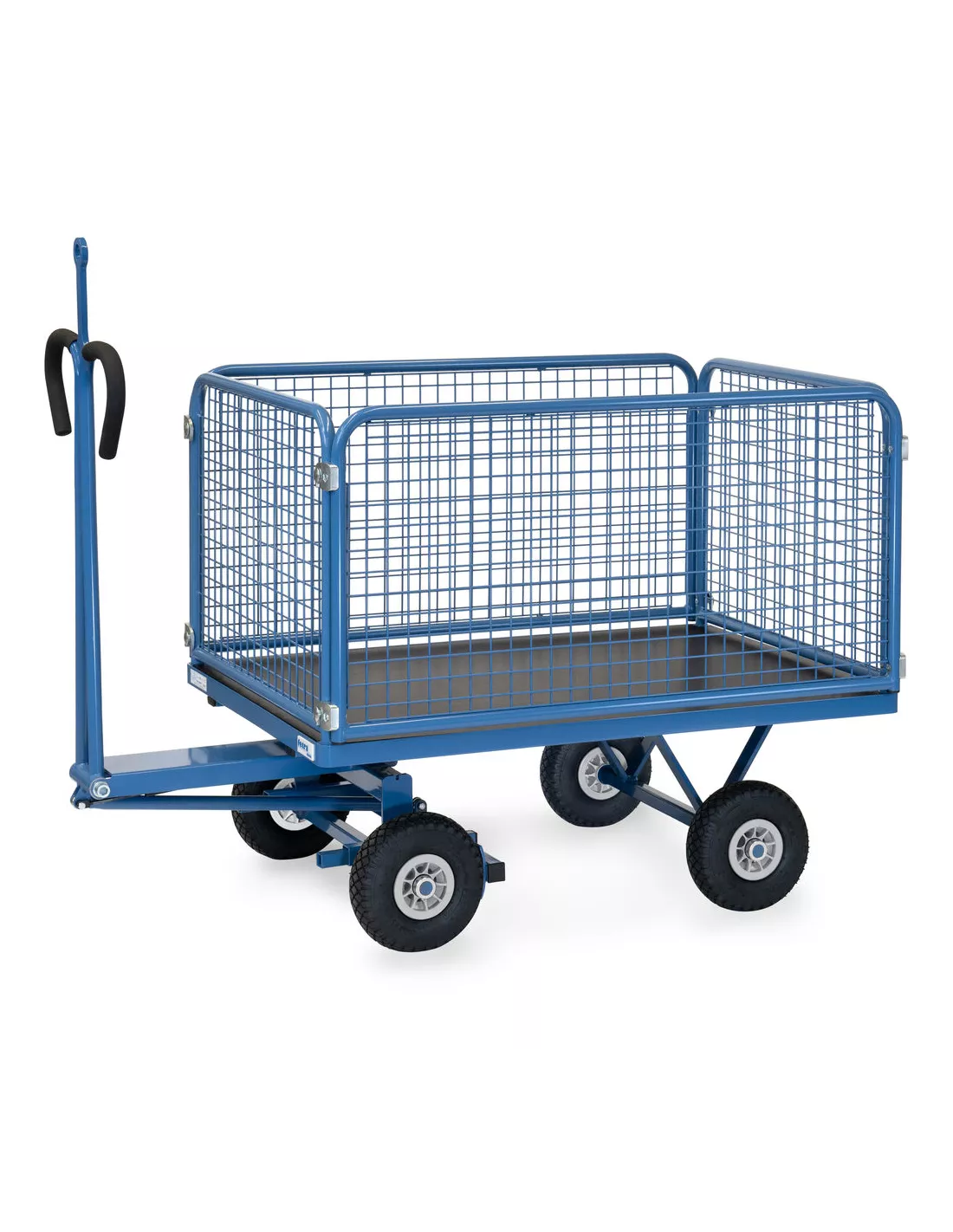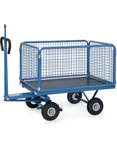 Ensemble mécano-soudé, revêtement époxy bleu RAL 5007. 4 inserts dans les angles, essieu sur rond à billes, timon en triangle avec poignée avec revêtement en plastique sécurisée remontant automatiquement en position verticale. Avec oeillet de traction, Ø interne 32 mm. Plateau en contreplaqué avec revêtement antidérapant et hydrofuge. 4 ridelles de 600 mm de haut boulonnées à la plateforme, grands côtés amovibles. Treillis métallique mécano-soudé, maille de 40 x 40 x 4 mm. Roues en mousse polyuréthane increvables, moyeu à roulement à rouleaux. Freinage automatique sur essieu avant.