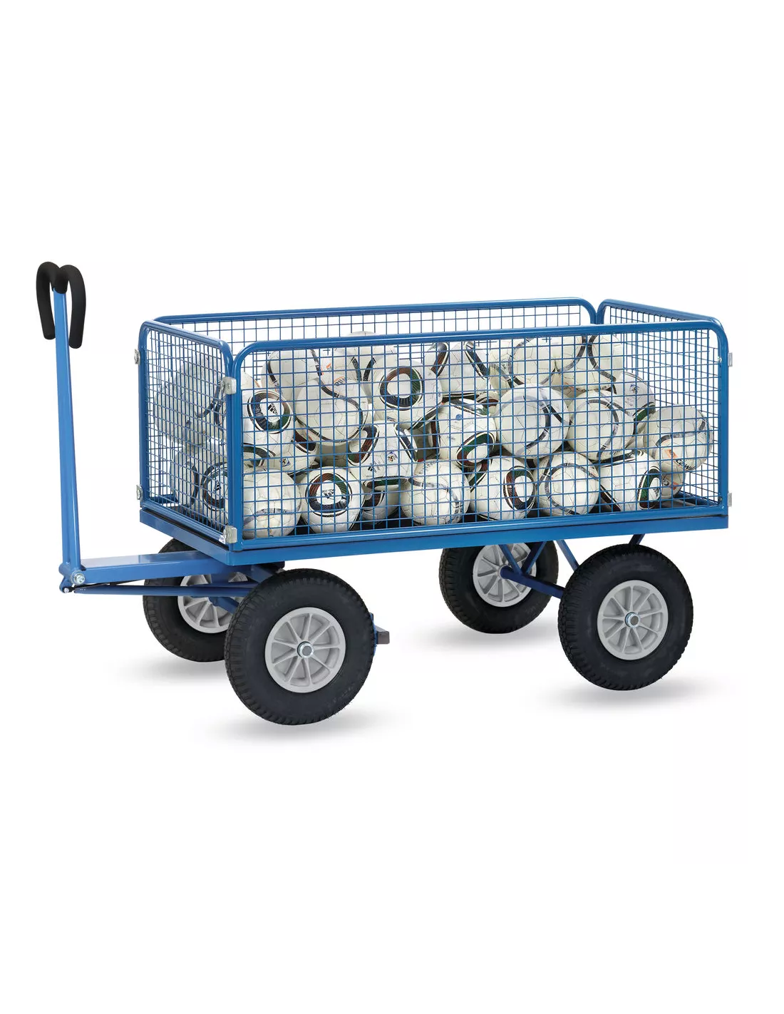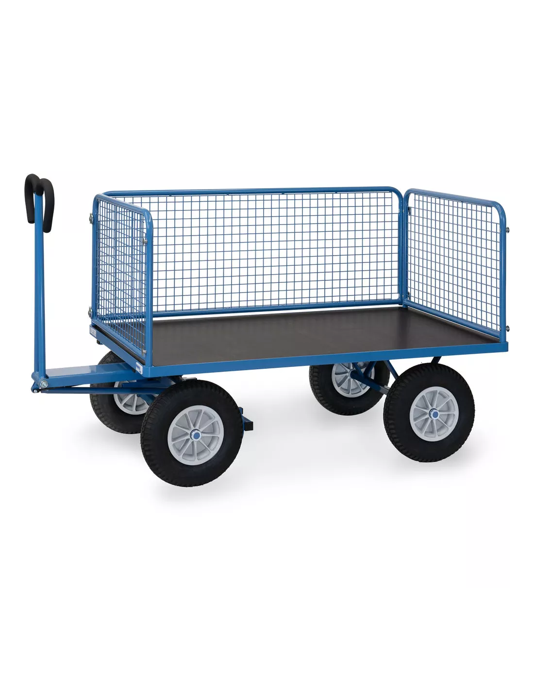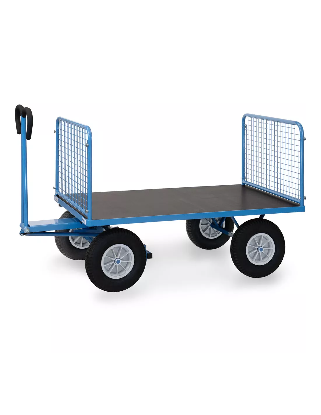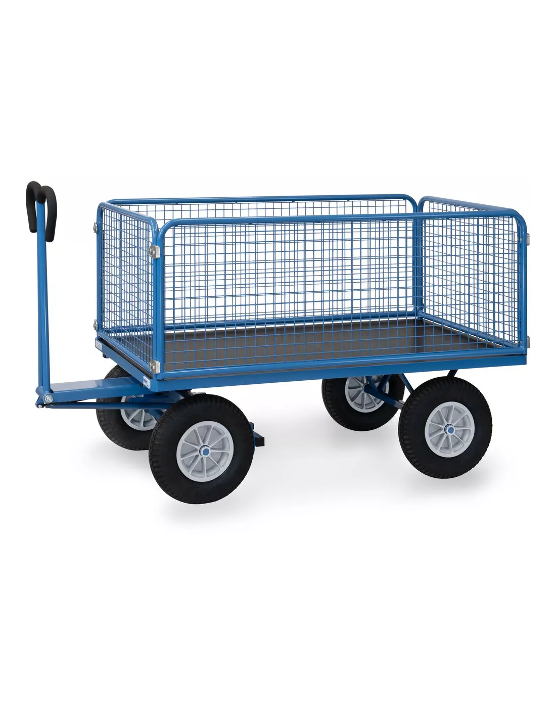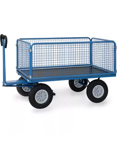 Ensemble mécano-soudé, revêtement époxy bleu RAL 5007. 4 inserts dans les angles, essieu sur rond à billes, timon en triangle avec poignée avec revêtement en plastique sécurisée remontant automatiquement en position verticale. Plateau en contreplaqué avec revêtement antidérapant et hydrofuge. 4 ridelles de 600 mm de haut boulonnées à la plateforme, grands côtés amovibles. Treillis métallique mécano-soudé, maille de 40 x 40 x 4 mm. Roues en mousse polyuréthane increvables, moyeu à roulement à rouleaux. Freinage automatique sur essieu avant.